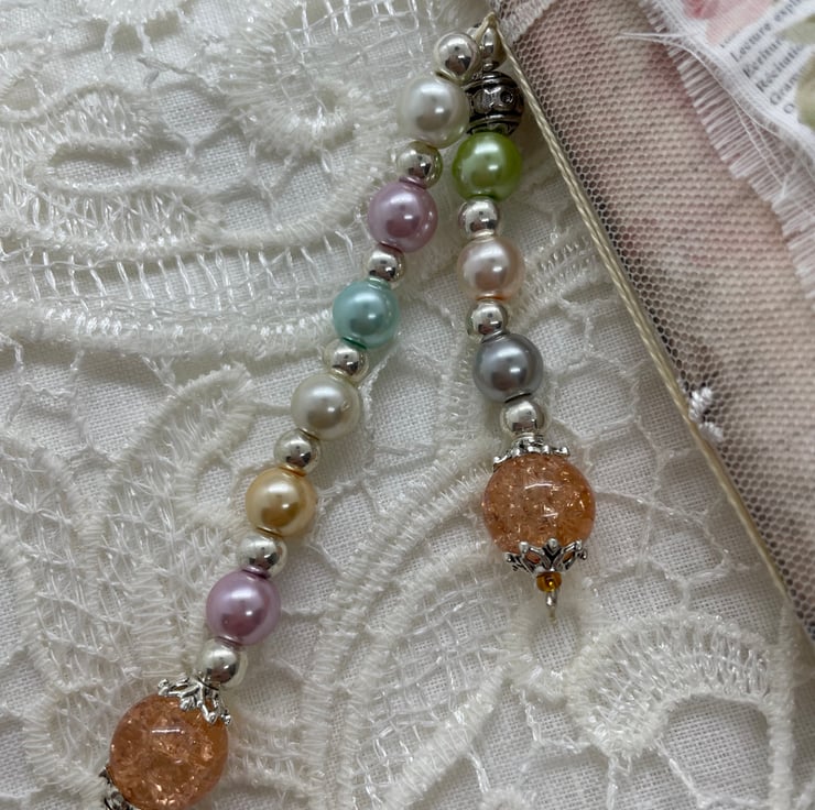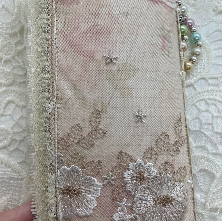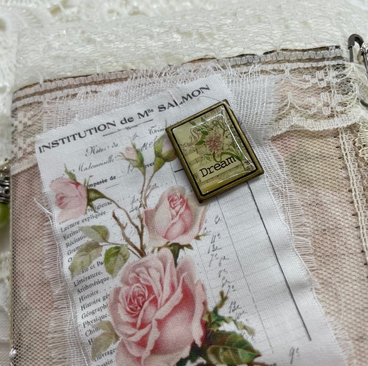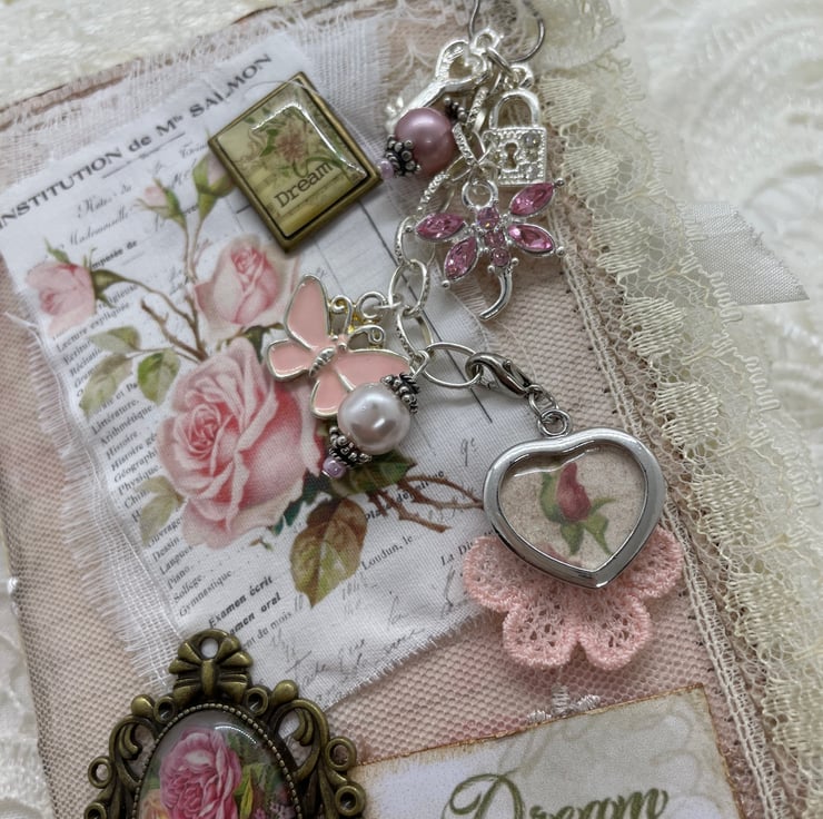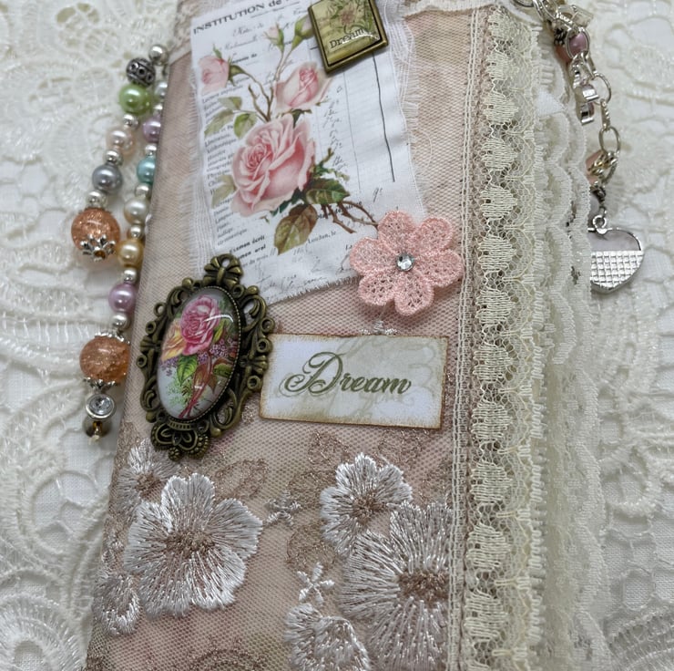 The front cover is covered in lace with a snippet rose label on cheesecloth. Cameo of roses. Delicate lace flower. Pearl bead dangles at the side and a pretty charm dangle on a bulb pin.