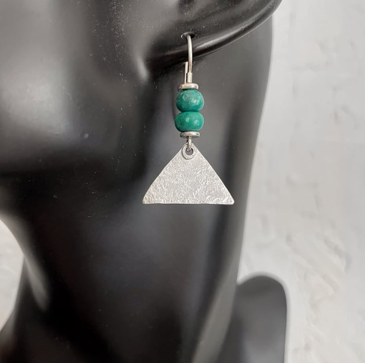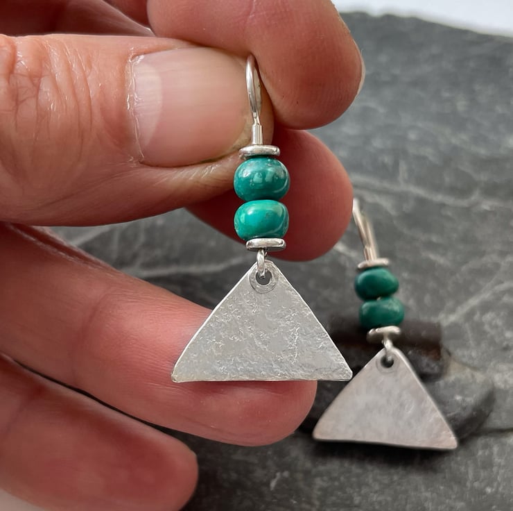 Triangles of silver with a beaten texture and a feature raised eyelet hang from handmade hooks that have a duo of bright hand cut turquoise beads beads.