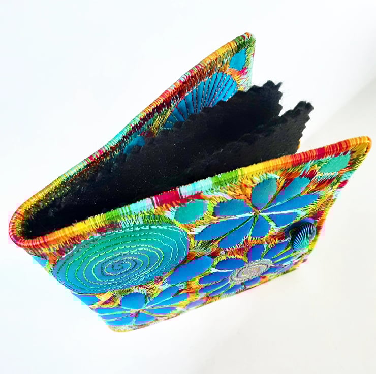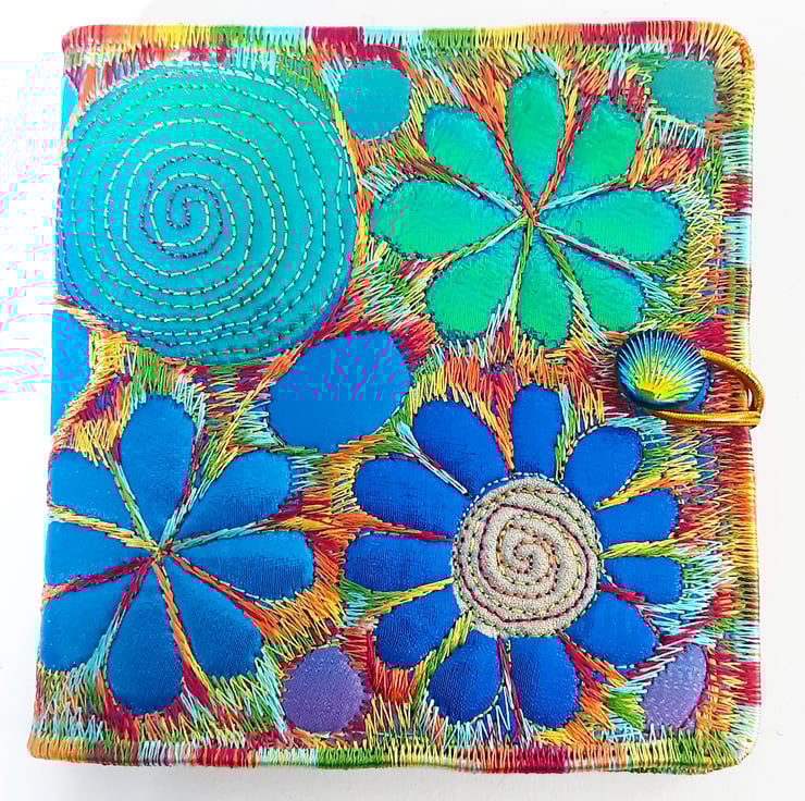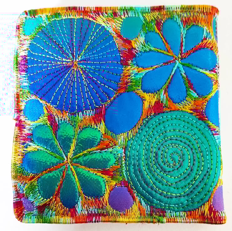 Made from layers of fabric including hand dyed Egyptian cotton and silk fabrics using the free machine embroidery style of sewing