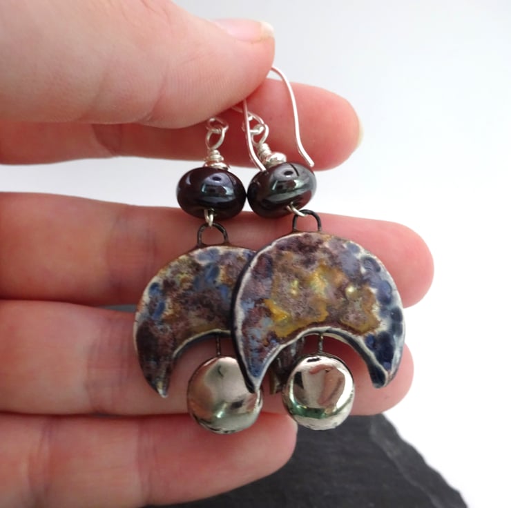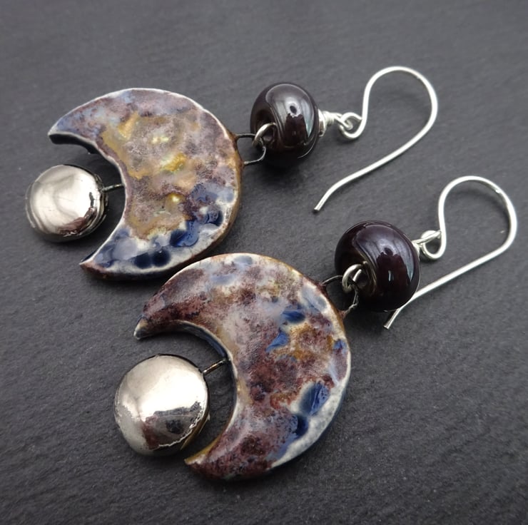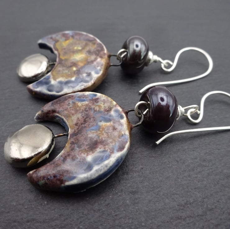 A pair of earrings made with handmade sterling silver ear wires, handmade lampwork glass beads, sterling silver beads and handmade ceramic drops which are moon shaped with a blue/brown glaze and feature a silver silver.