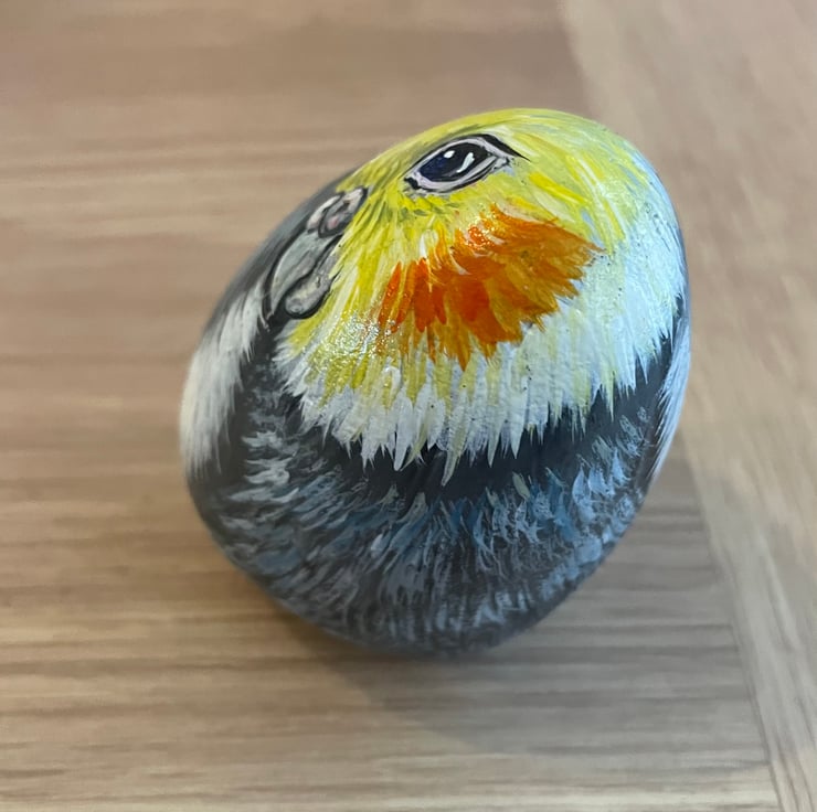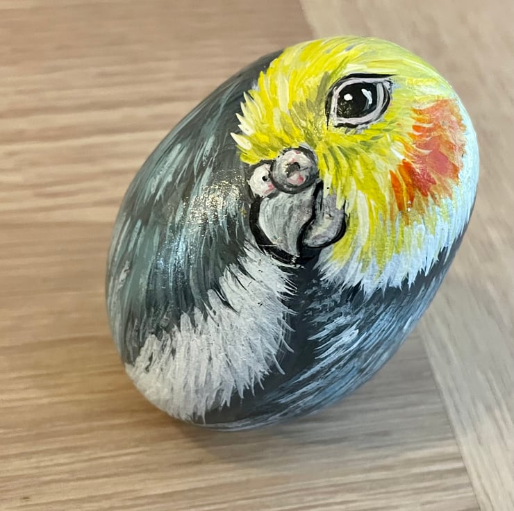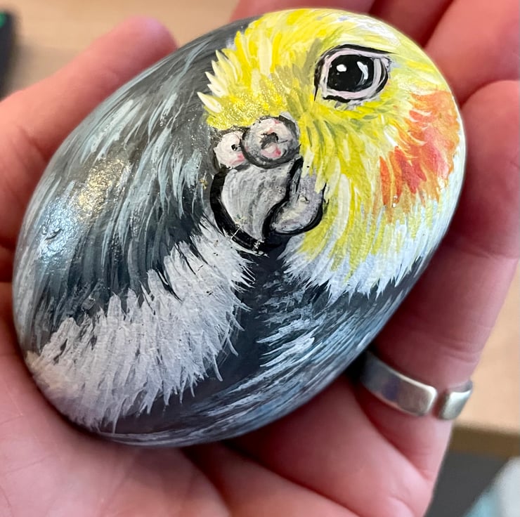 This cockatiel has been hand painted onto a smooth stone and glazed for a glossy protective finish