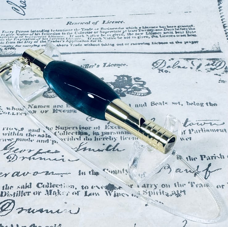 This is a Gold Keyring Whistle with a deep azure blue and black resin body finished in a polished coating.
