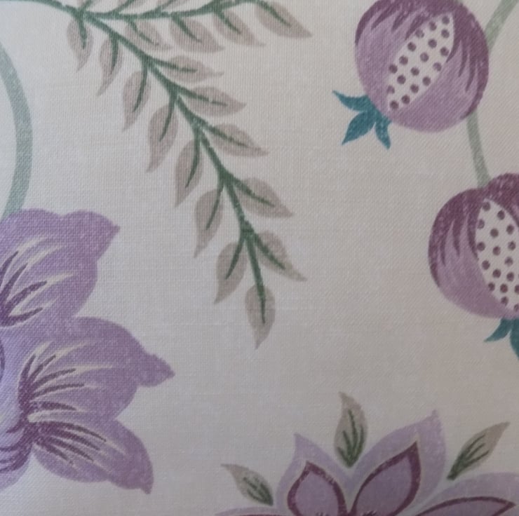 The fabric is made from a mix of 51% cotton and 49% linen, so it feels beautifully soft as well as being hard wearing. The design features purple grapes and flowers and green foliage on a light cream background.