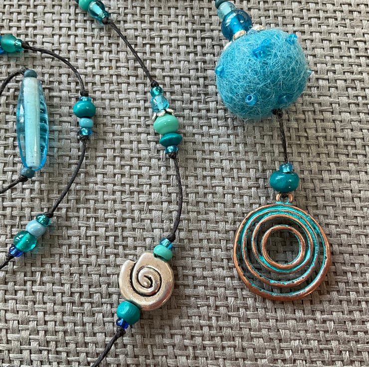 Lariat necklace featuring a glorious mixture of beads in shades of turquoise and blue. The beads include painted wood flowers, felt balls, glass, glass foil, millefiori and wooden beads, as well as antique silver tone shell, spiral and flower beads. The necklace is finished at the ends with verdigris copper charms and is strung on strong, flexible waxed linen thread.