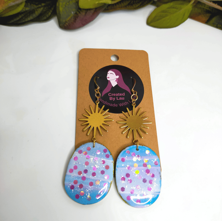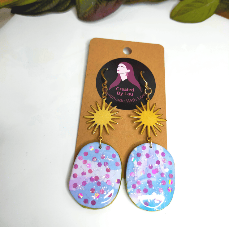 The oval dangles are crafted from polymer clay to give that gorgeous marble effect, and each one is unique – just like you! They're finished with elegant gold-plated ball studs and a striking brass sun charm for a touch of bohemian sunshine.