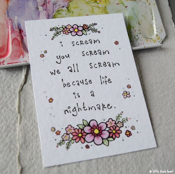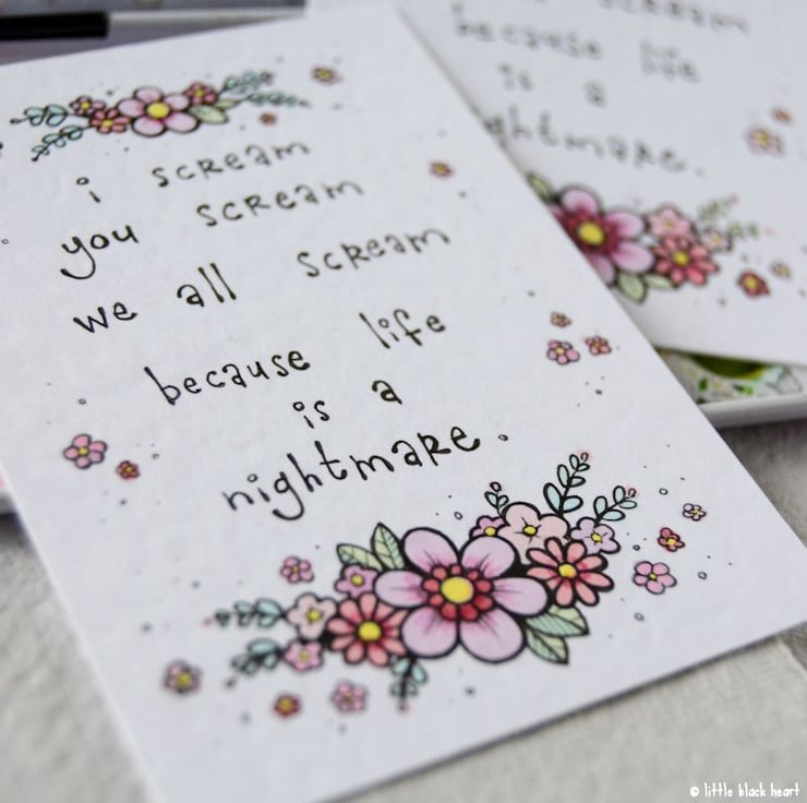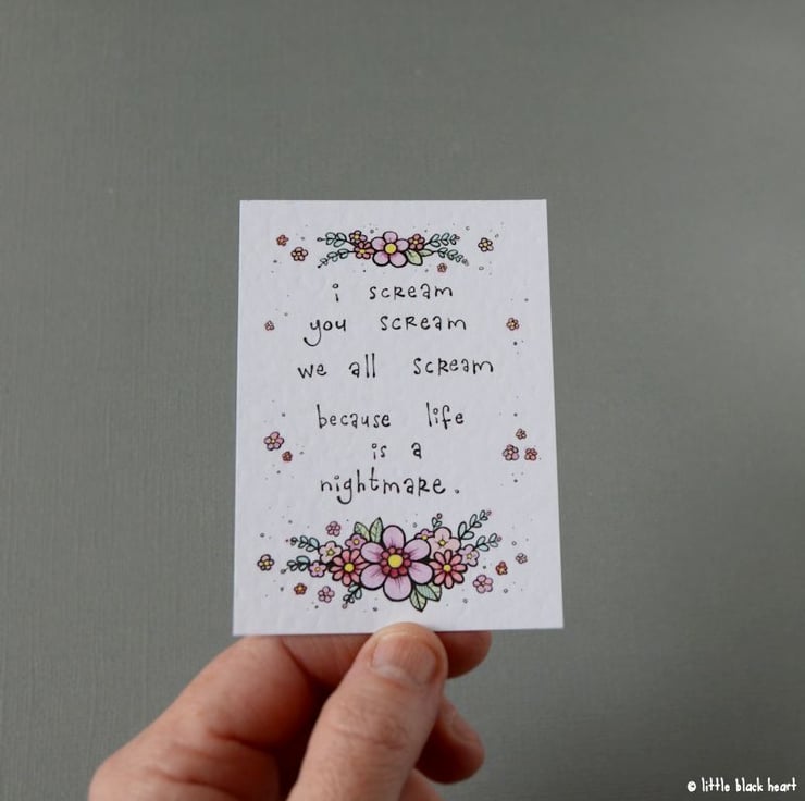 original hand drawn artwork, on textured white 300gsm cardstock. drawn with a tiny 0.05 nibbed pen, and carefully coloured with art pens and pencils.