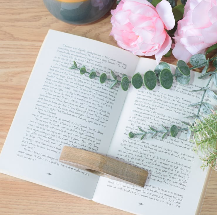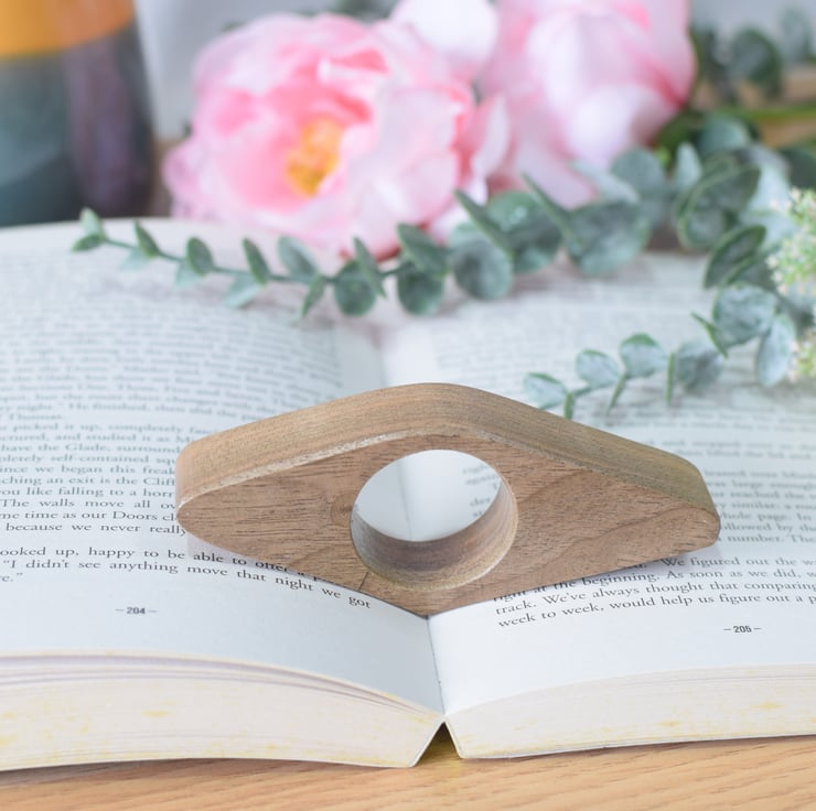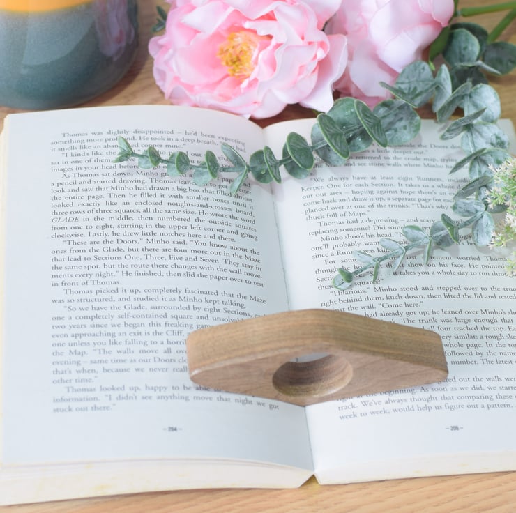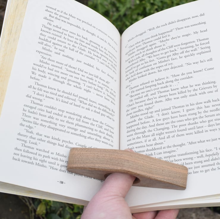 A wooden thumb rest to help hold books open while you read. These can take the strain off your thumb and wrist and make it easier to hold the book open.