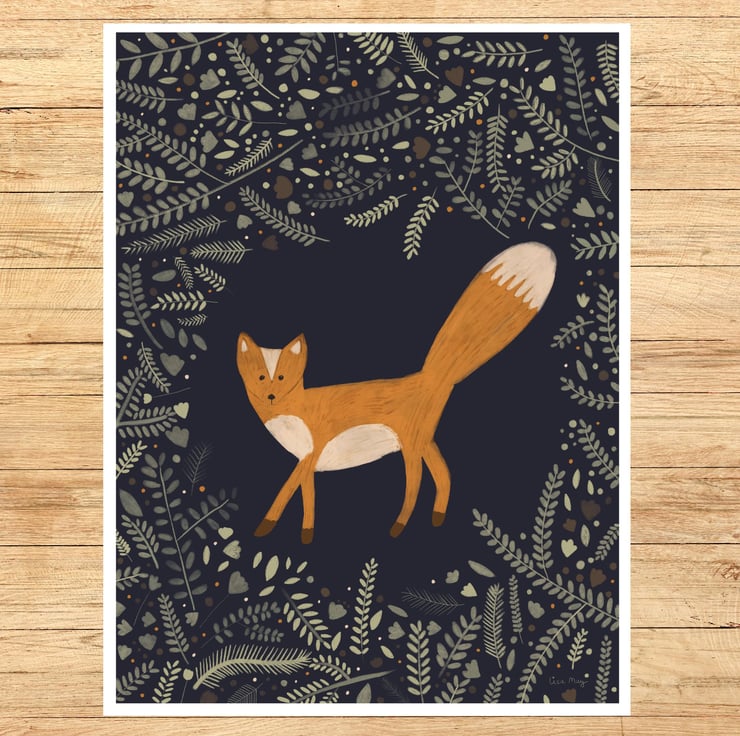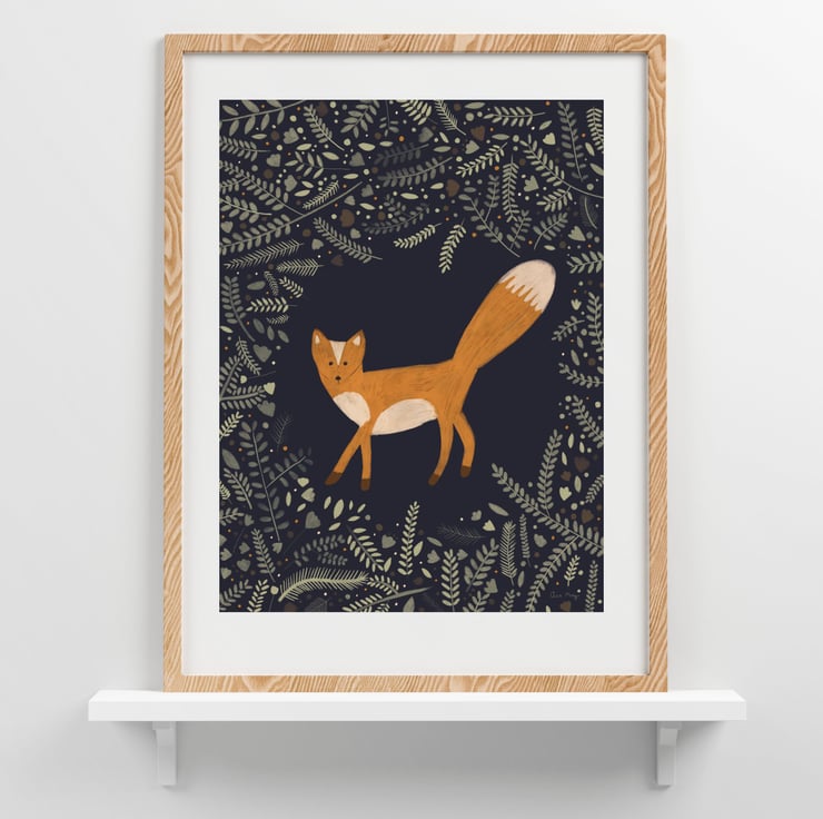 Fine Art Giclee Print 16"x12" - Felix the Fox in the Forest illustration - navy