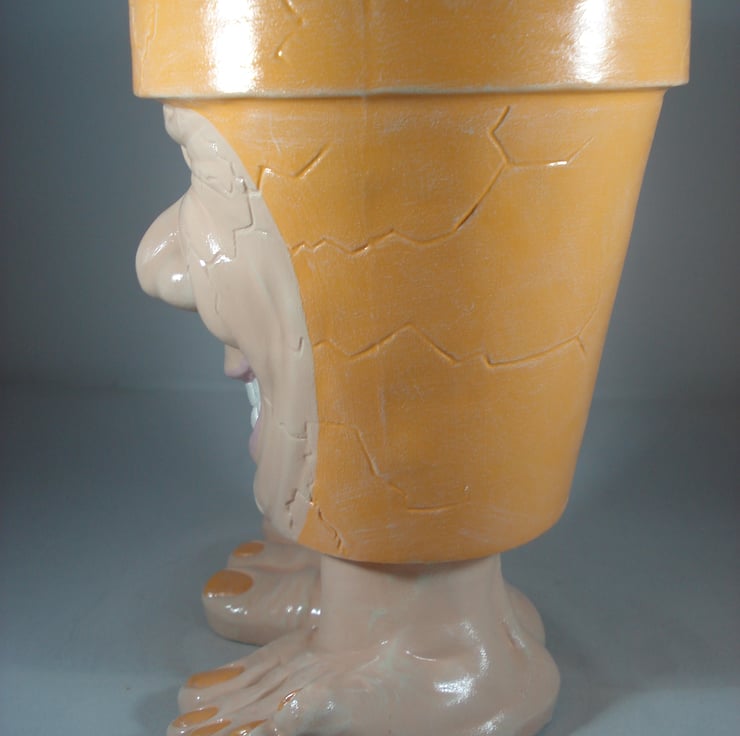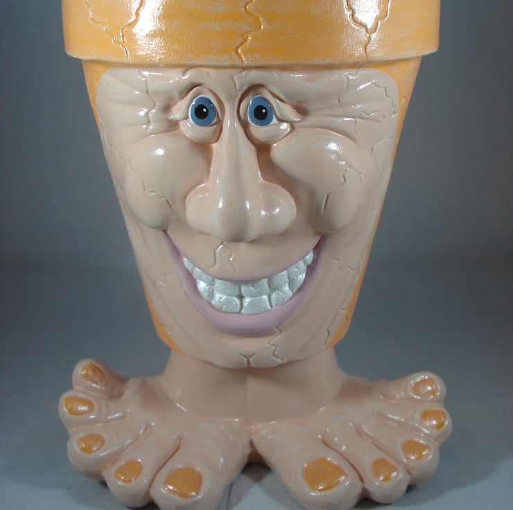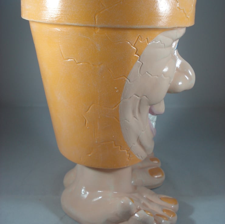 I have for sale a ceramic novelty plant pot, which was hand painted by myself. It is in a bright orange colour, with a lovely smiling face on the front and standing on a pair of legs and feet. This pot has no drainage holes in the bottom, so it could be used indoors or out. This would make a fun and novel addition to anyone's home, garden, patio or perhaps given as a gift.
