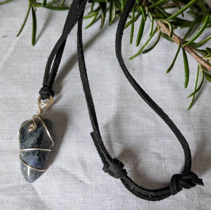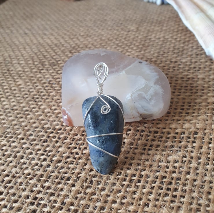 Deep blue sodalite crystal with grey patterning and a small spiral wire wrap design.