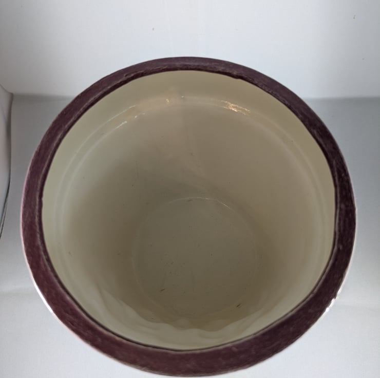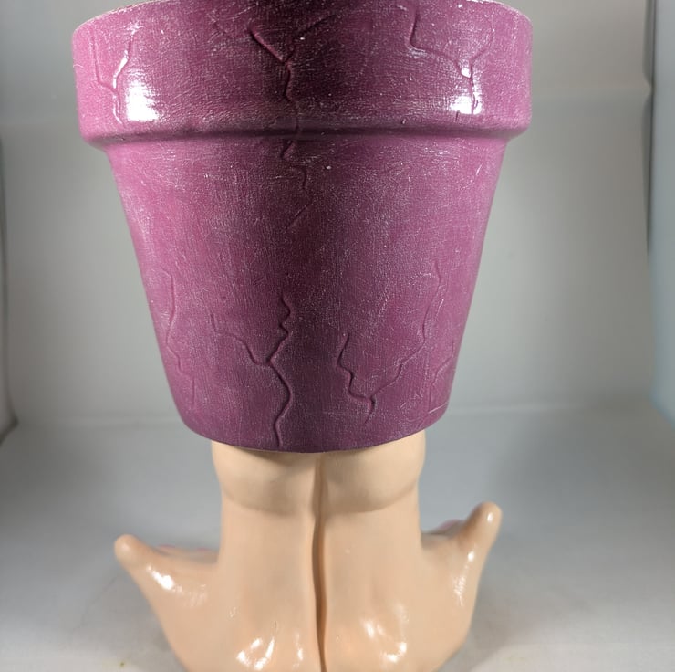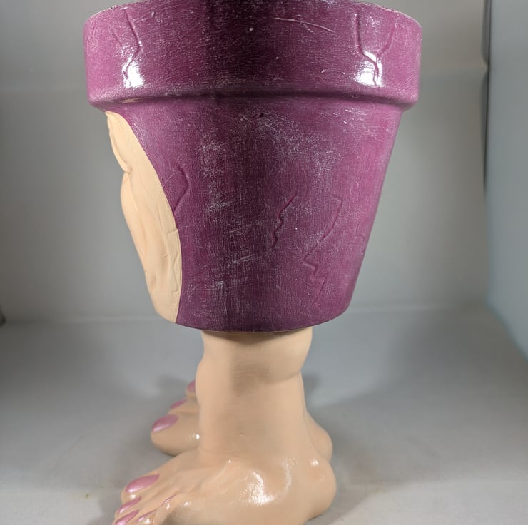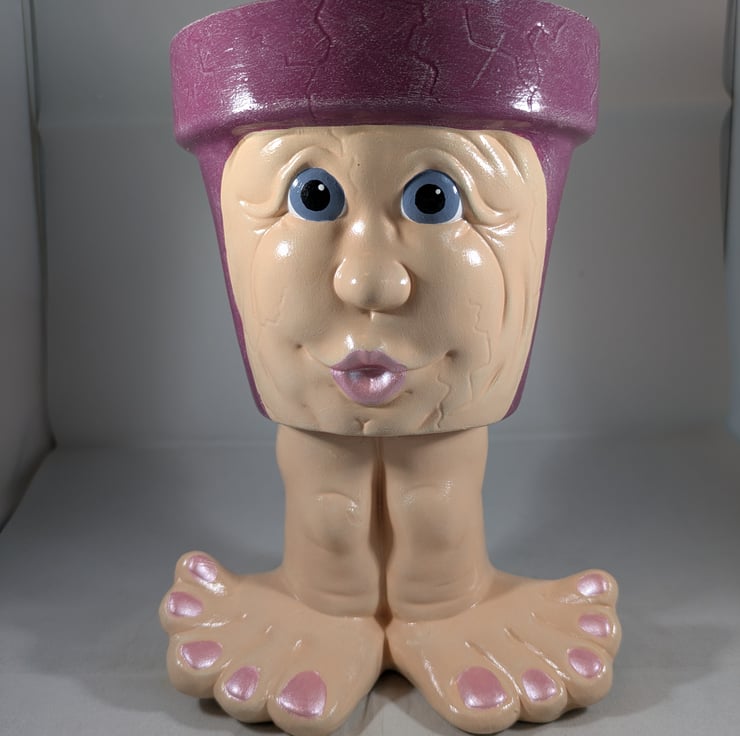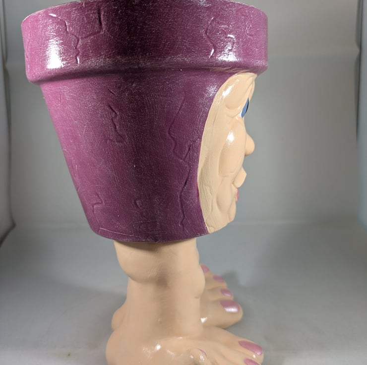 I have for sale a novelty ceramic plant pot, which was hand painted by myself. It is in a purple colour, with a lovely face on the front, standing on a pair of legs and feet. This pot has no drainage holes in the bottom, so it could be used indoors or out. This would make a lovely addition to anyone's home, garden, patio or perhaps given as a gift.