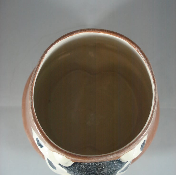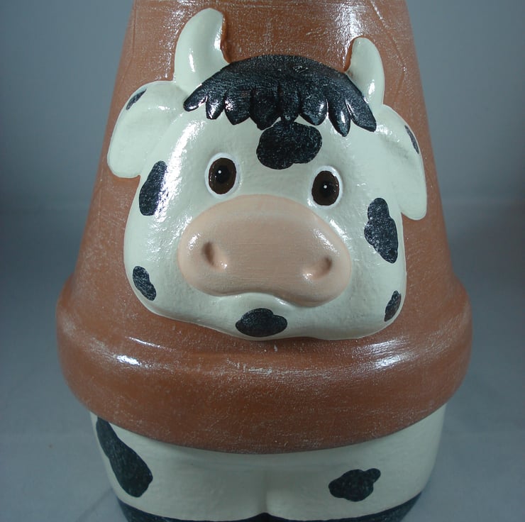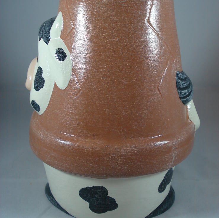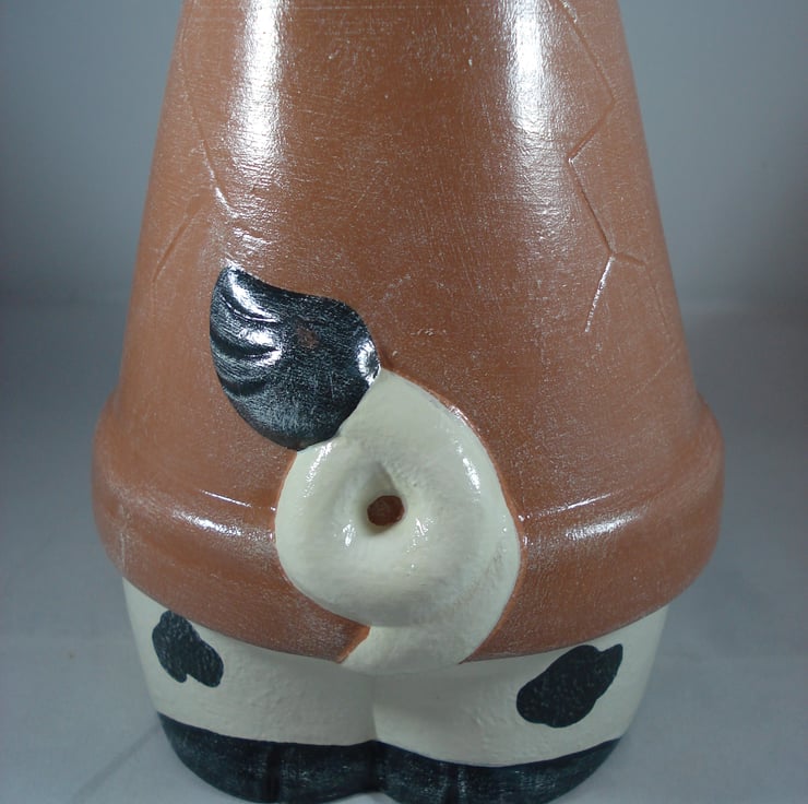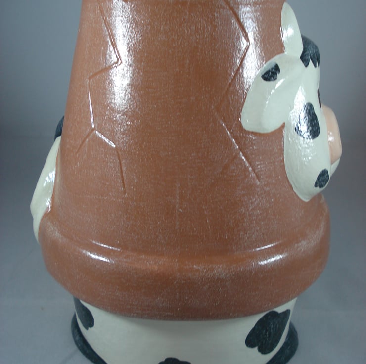 I have for sale a ceramic novelty plant pot, which was hand painted by myself. It is in a terracotta colour, with a black and white cow's face, tail, legs and feet. This pot has been clear glazed inside and has no drainage holes in the bottom, so it could be used indoors or out. This would make a fun and novel addition to anyone's home, garden, patio or perhaps given as a gift.