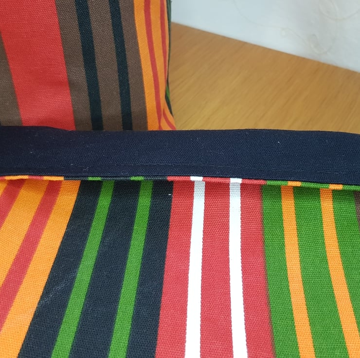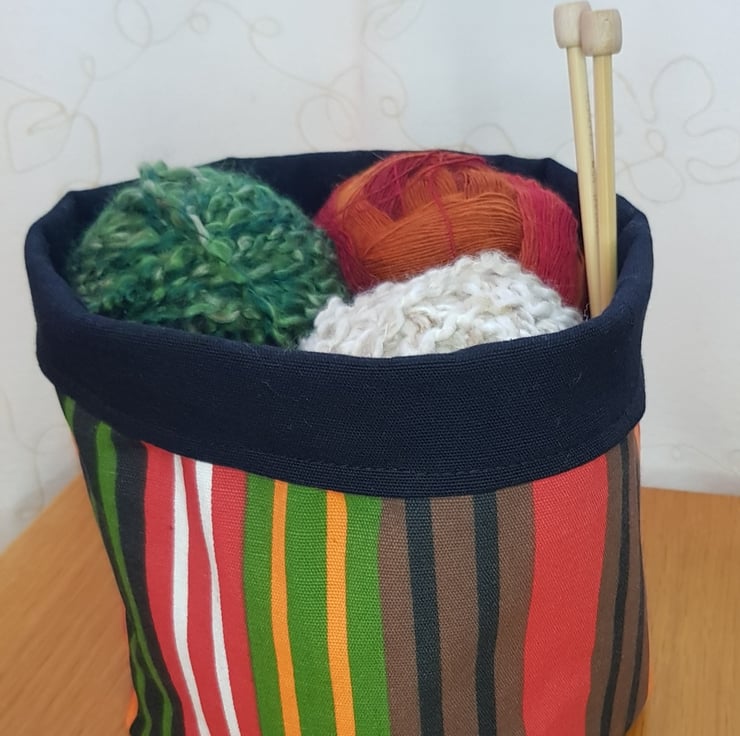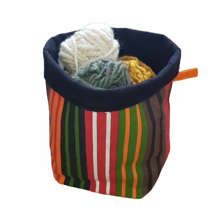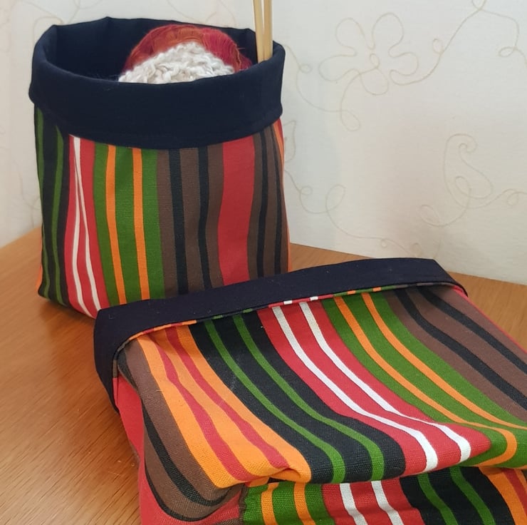 This storage "basket" is repurposed made from a tablecloth. The striped fabric and the lining are strong cotton canvas.