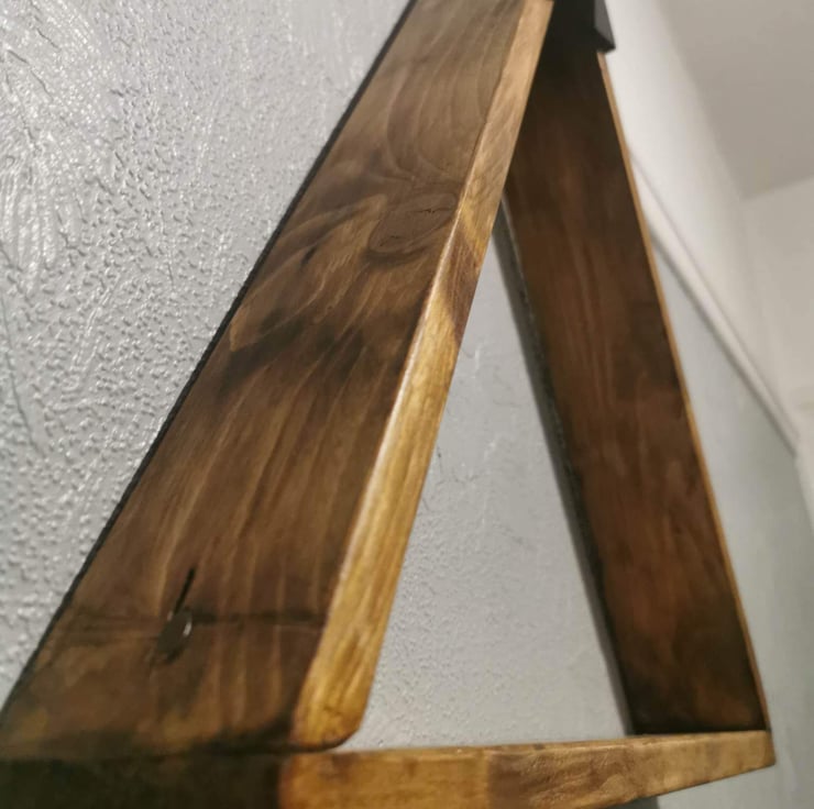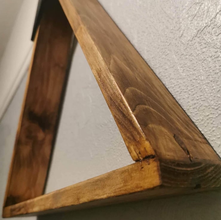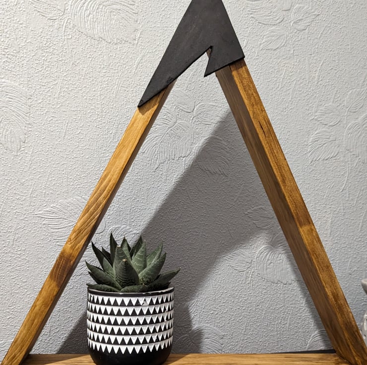 Geometric mountain shelf was designed to celebrate our 1st year back in November 0f 2022 finished with a dark oak stain and sanded smooth with black it's sure to stand and catch and eye with the wood grain enhanced for detail.