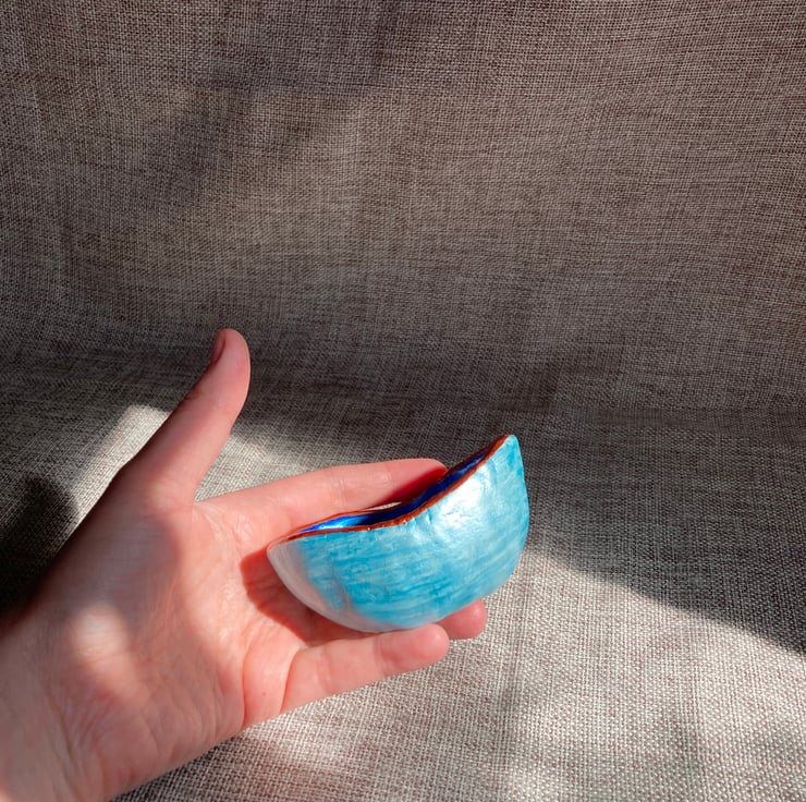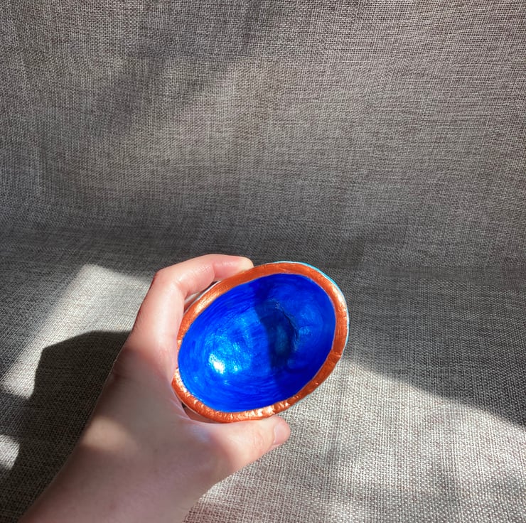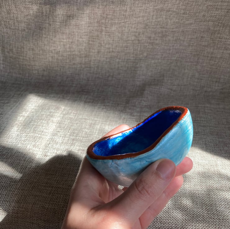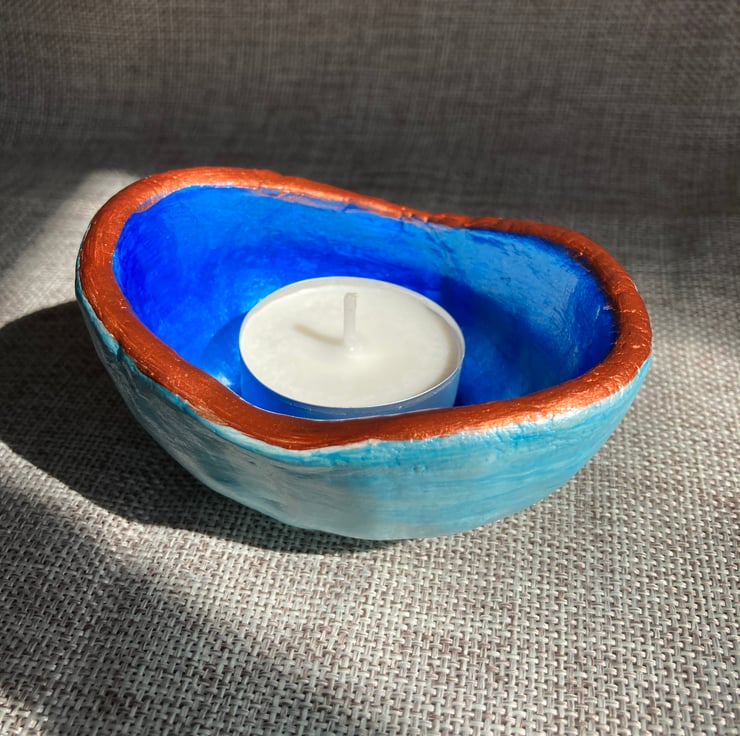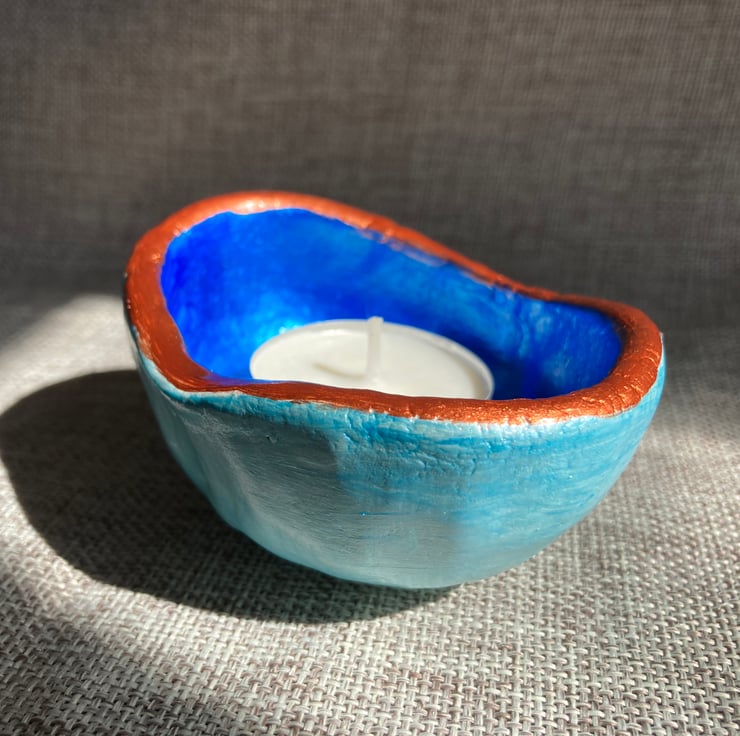 This is a one-off unique handcrafted clay tea light candle holder. It is finished in pearlescent blue and copper acrylic paint, with a varnish topcoat to protect and enhance the shimmer.