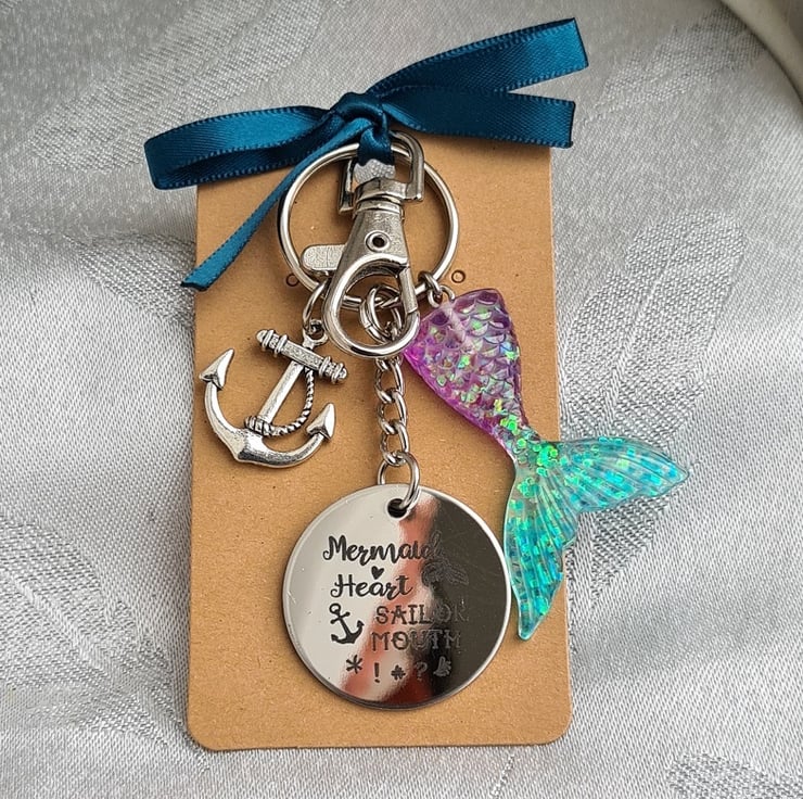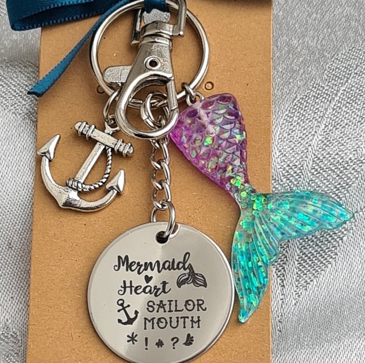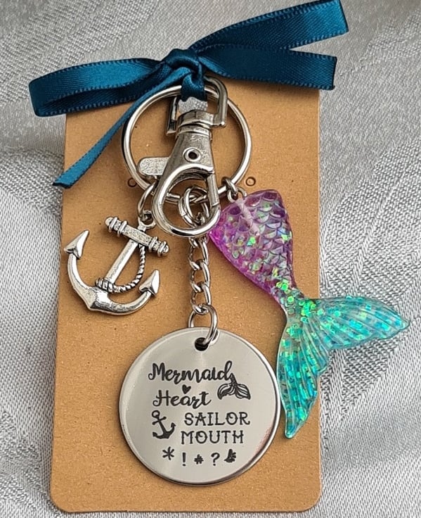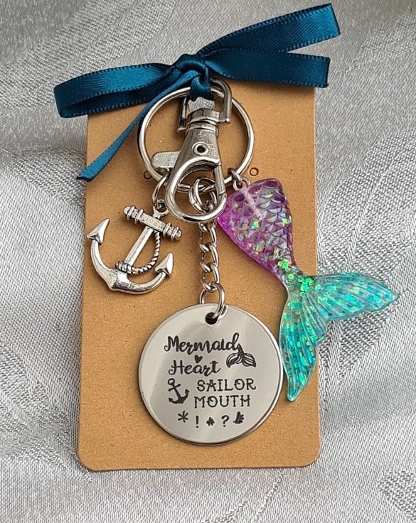 A lovely bag charm/key ring for those who love mythical Mermaids. This gorgeous key ring consists of a laser engraved steel tag that has "Mermaid Heart Sailor Mouth" on it, an anchor charm and a Pinky Purple/Blue mermaid tail charm. Great as a gift.