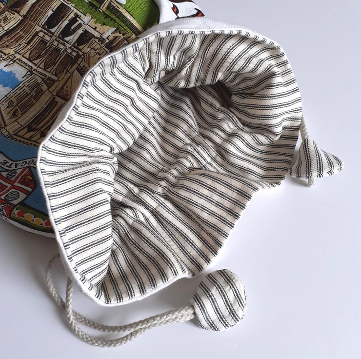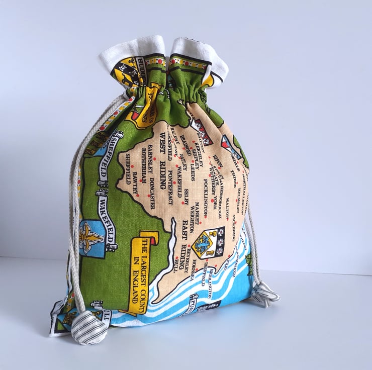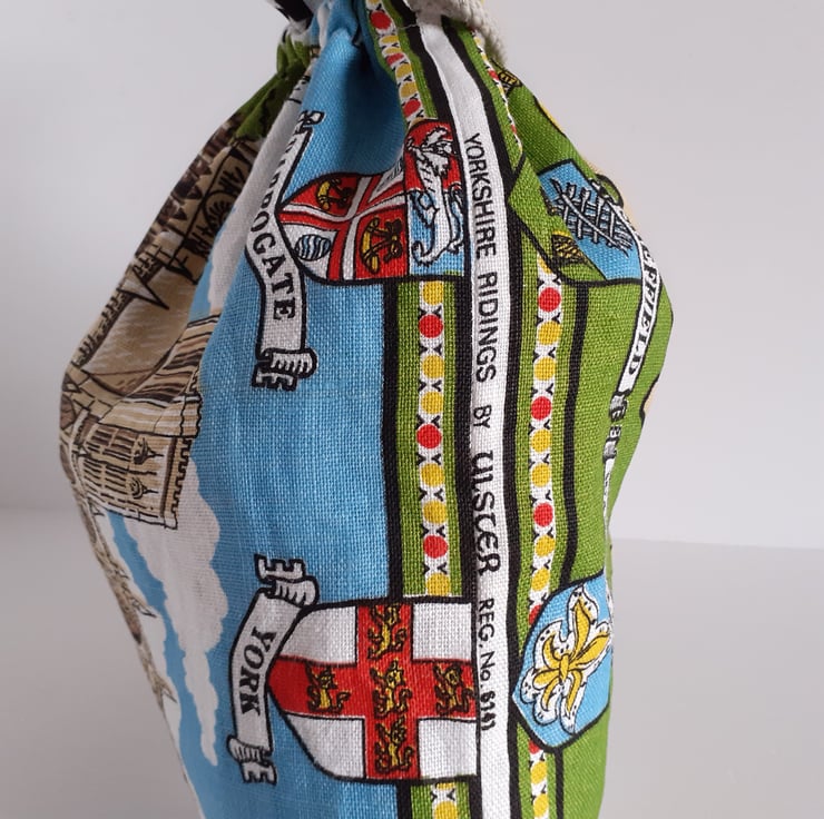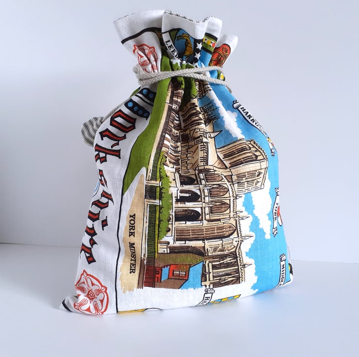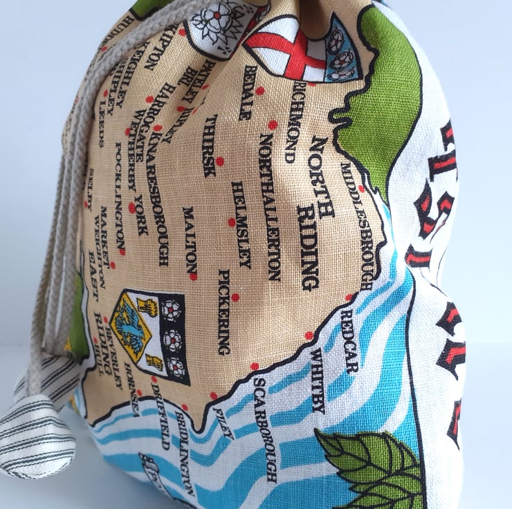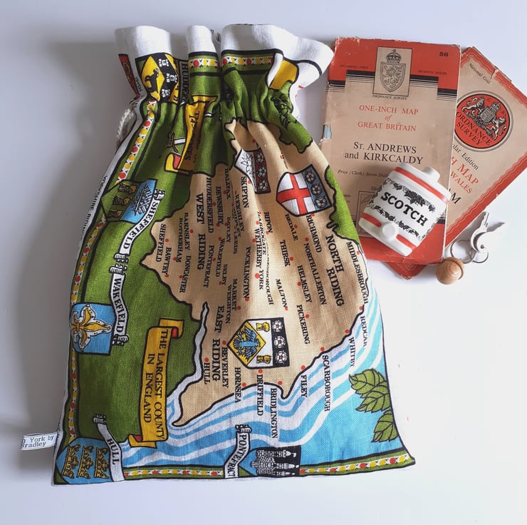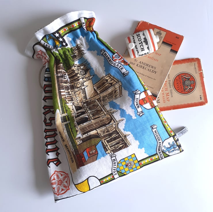 A drawstring bag upcycled from a vintage tea towel of Ulster linen. It shows a brightly illustrated map of The Ridings of Yorkshire on one side, and on the other is York Minster with a fabulous italic script spelling out that grand name – Yorkshire! Perfect as a suitcase organiser for sandals, as a small bag for washing, or just a place for storage. It would make a great present for those professional Yorkshire folk out there, as a gift for Dad, or perhaps as a going to Uni present.
