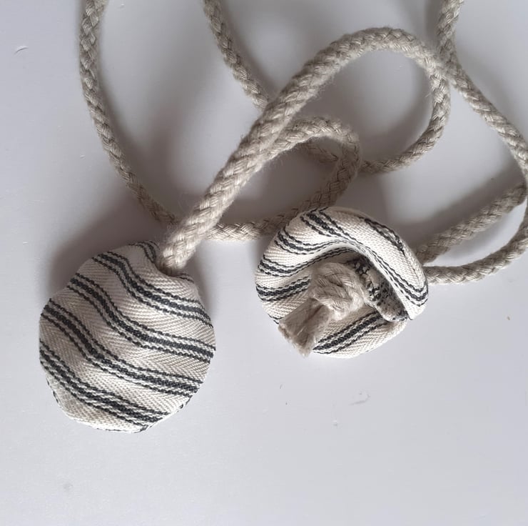 The drawstrings are made of cotton rope, and finished off with a little floral head pull. It draws up to give a slight ruffle around the top edge.