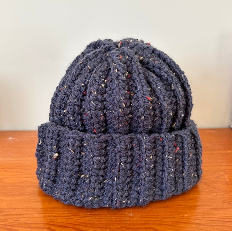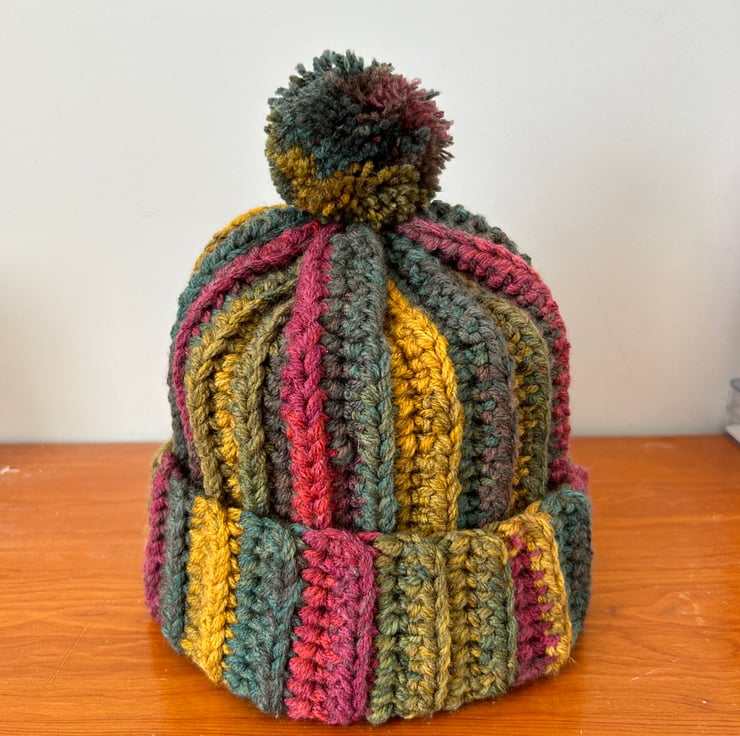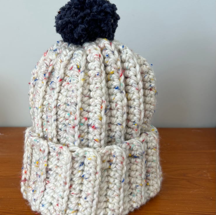 Soft and chunky hand crocheted hat that can come with or without the bobble. Wonderfully warm and can be folded to make a wider brim depending on the size of head.