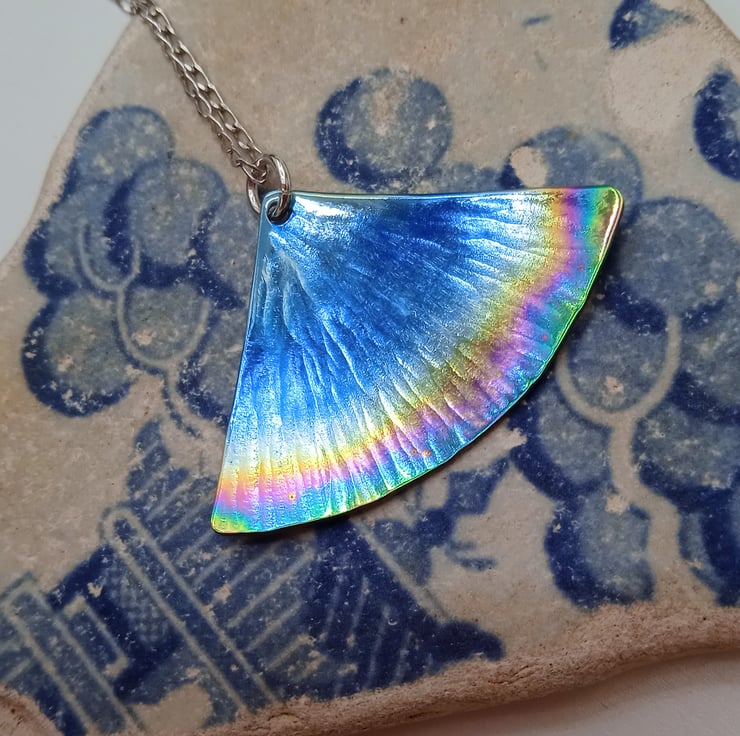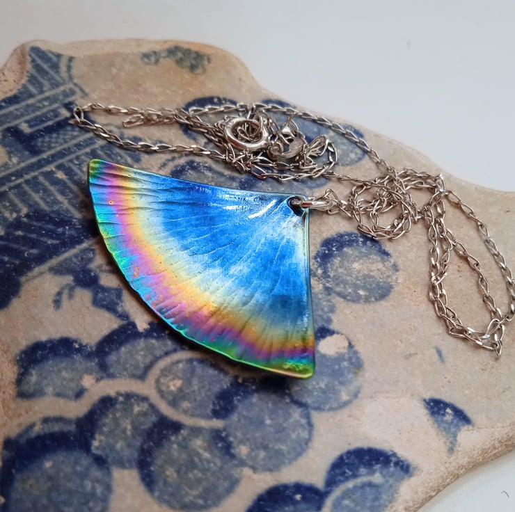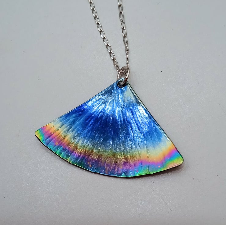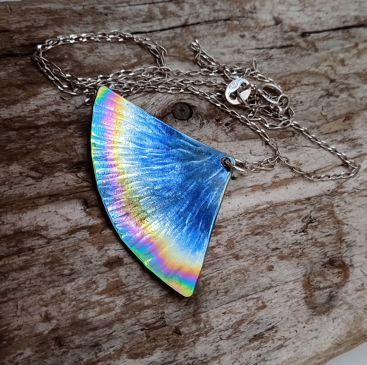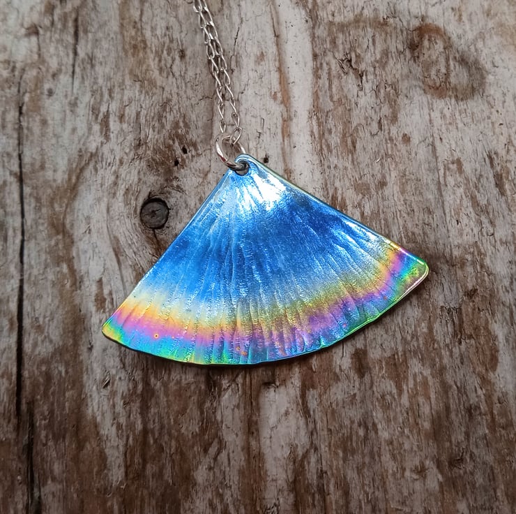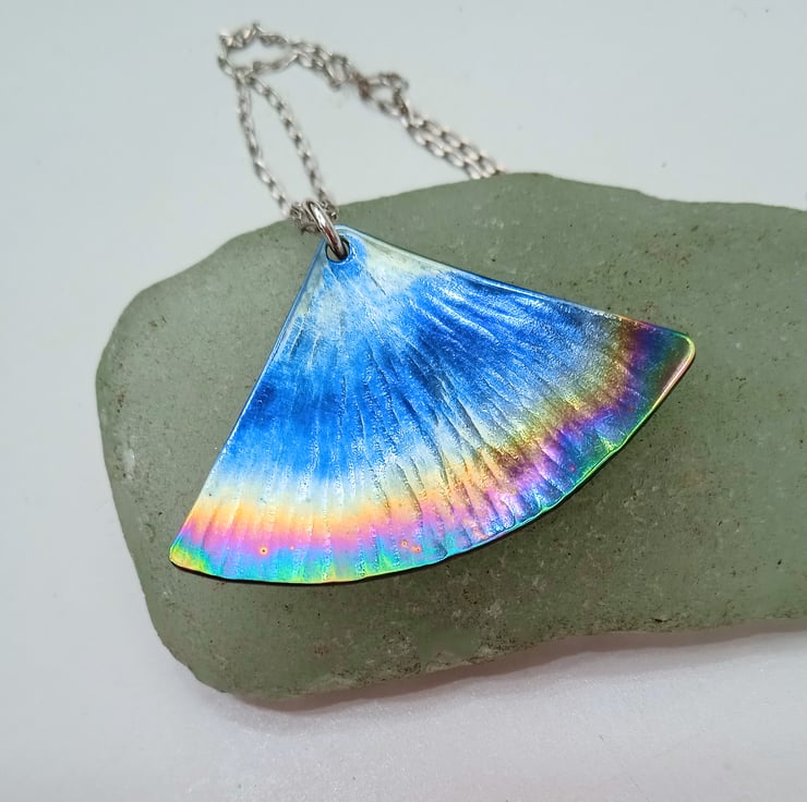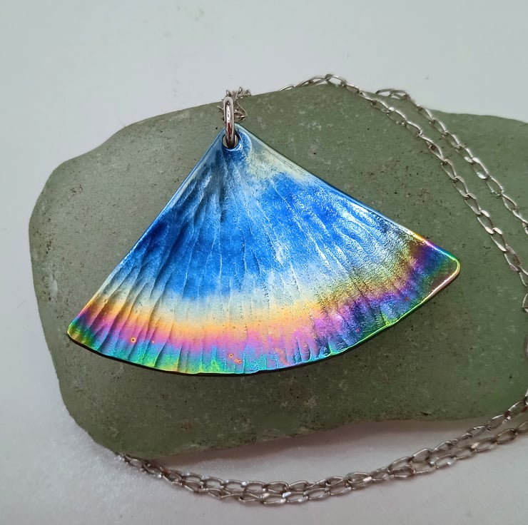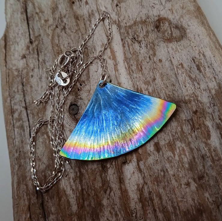 I have created this beautiful pendant by hand sawing the shape from titanium sheet then hammering it to create an interesting texture. I have then domed it to create shape before colouring.