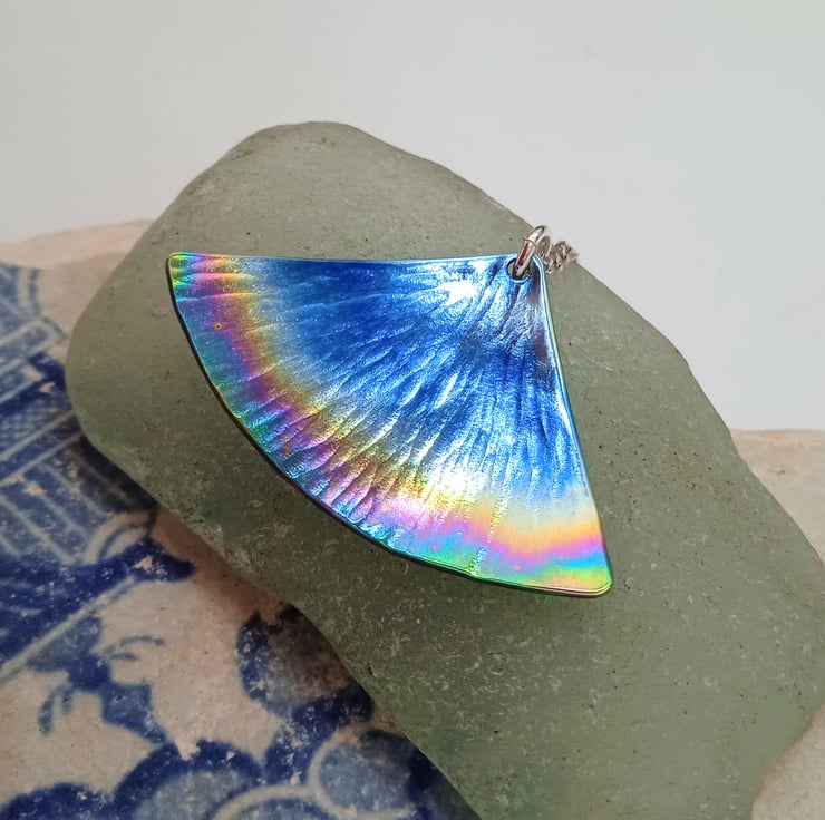 This titanium pendant necklace displays a range of attractive shades which really come to life when the light hits it.
