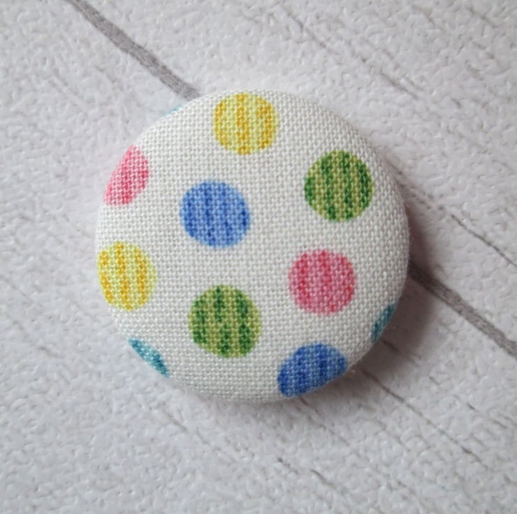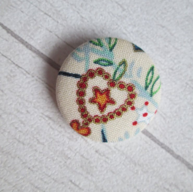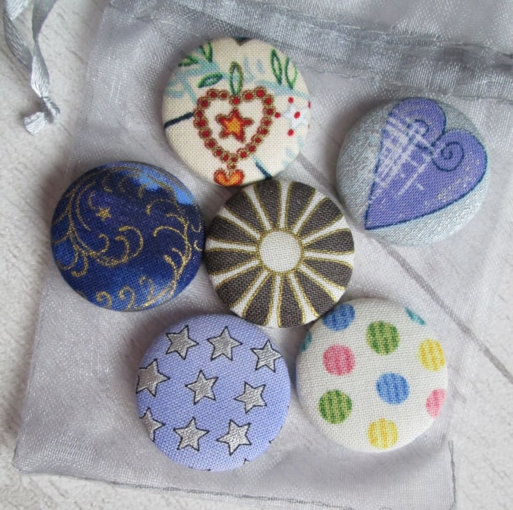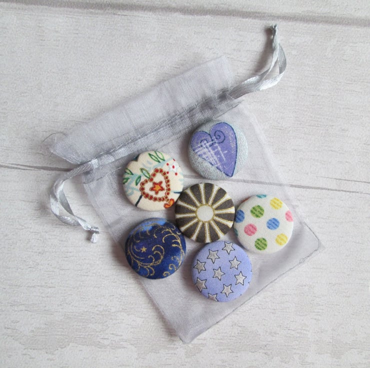 A little organza bag containing six metal pin badges each covered with a different snippet from my treasure box of pretty fabric scraps. Would make a lovely small gift or stocking filler. Each badge measures 28mm in diameter.