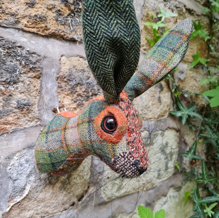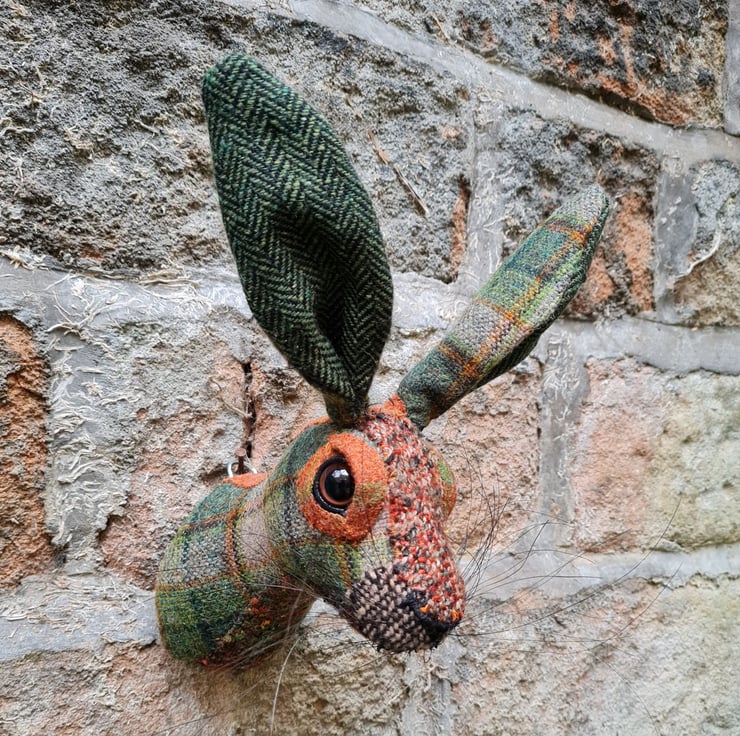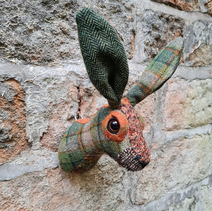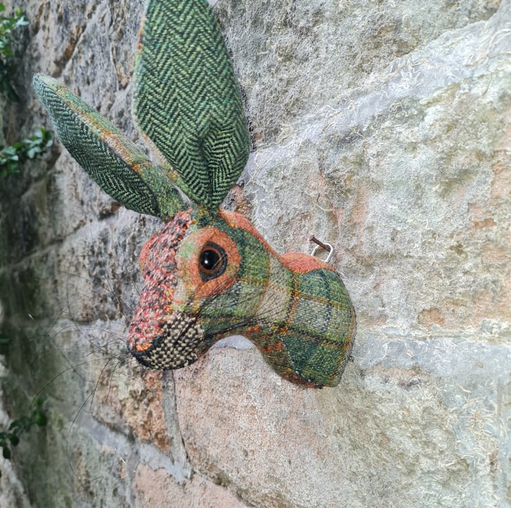 This is Mr Harry. A lifesize faux hare which I have handmade and covered in hand stitched green and orange wool fabric. The head is backed with felt and has a metal hanger to hang it on the wall. It is lightweight.
