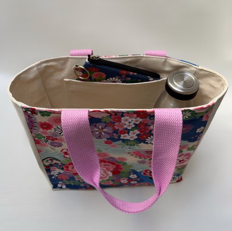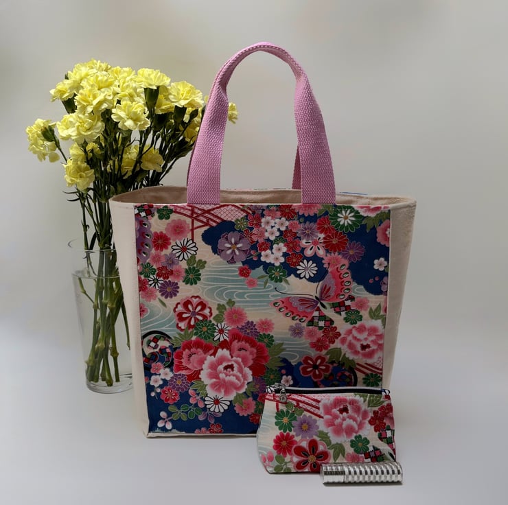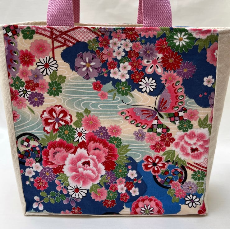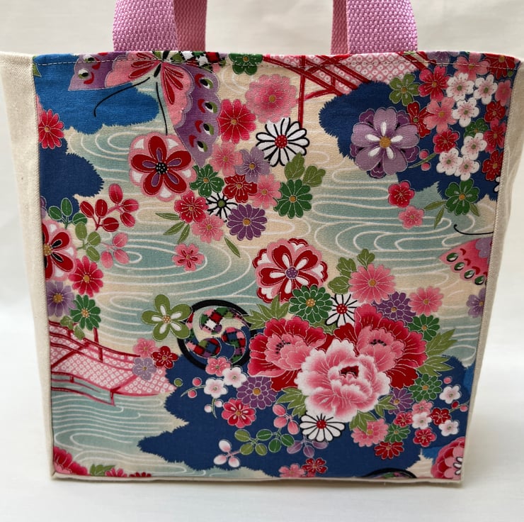 The bag has been created using two layers of fabric; the gorgeous Japanese fabric and canvas for the outer, and canvas for the inner to create a sturdy bag that will hold its shape. There is a magnetic closure to keep belongings secure. The handles have been created from fabric webbing. The bag could be used as a handbag, project bag, small shopping bag or day bag.