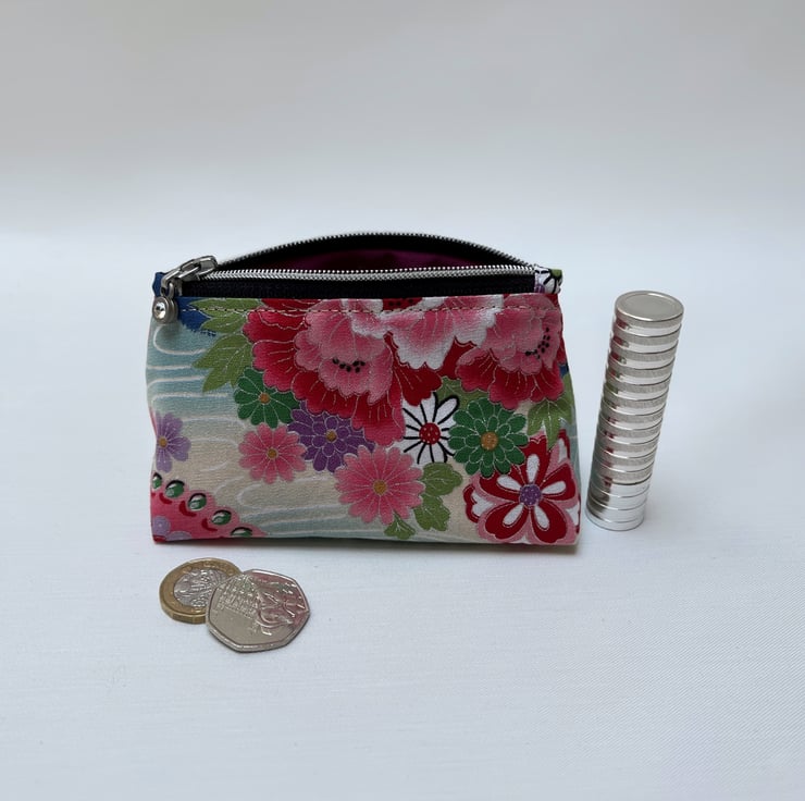 The coin purse measures 12 cm long by 7cm tall by 6cm deep at the base. It has a 10cm zip with a jewelled zipper pull and the interior is crafted from pink cotton fabric. This coin purse is longer than previous versions.