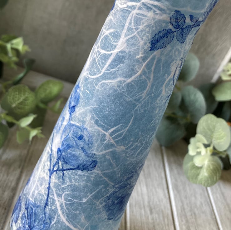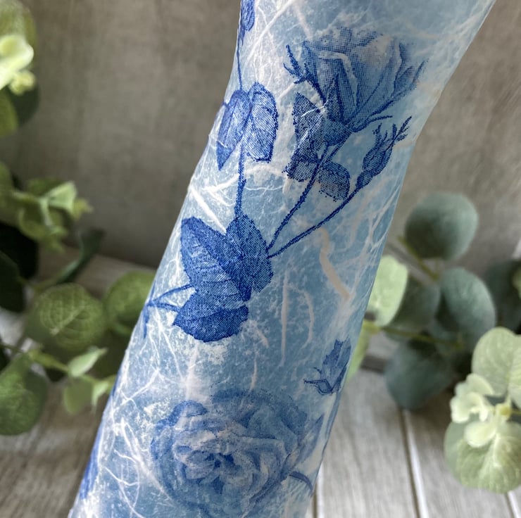 The glass vase has been decorated using a textured technique and then decoupaged with a pretty blue rose design. Several coats of heat and water resistant varnish has been applied for protection.