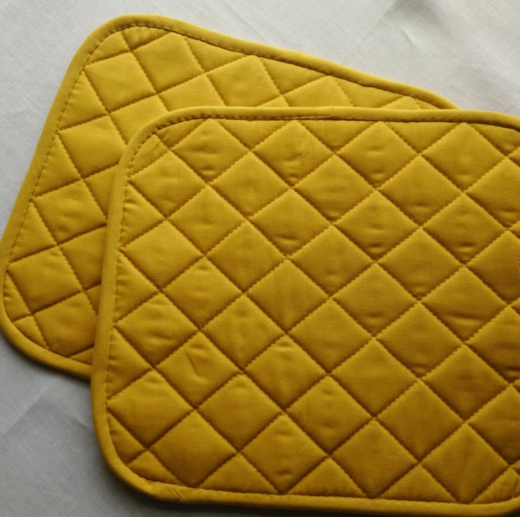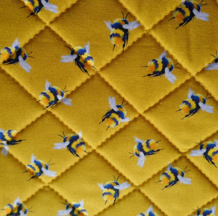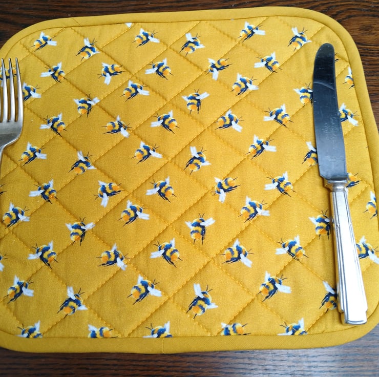 Placemat, Quilted Heat Resistant, made in 100% Cotton Fabric Gold with Bees. Made from a gold/mustard Bee fabric with a plain gold/mustard backing and binding. They have 2 layers of heat resistant wadding inside each mat. The binding is handmade from the same fabric as the backing fabric and hand sewn on the reverse side. made to a very high standard.