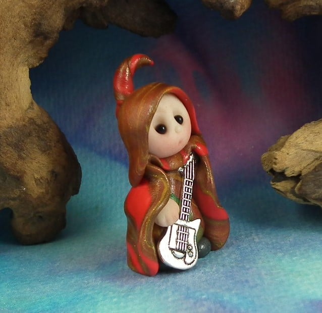 This is a 'one of a kind' creation having been entirely handmade without the use of moulds here at my studio on the Sussex Coast. Modelled with Prosculpt polymers, painted with heat set paints before sealing with lacquer, Dell has sparkling black onyx eyes and a metal guitar. He is just one and a half inches tall and has been instructed not to make any noise in transit ...