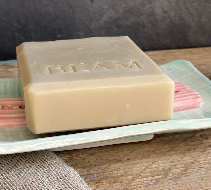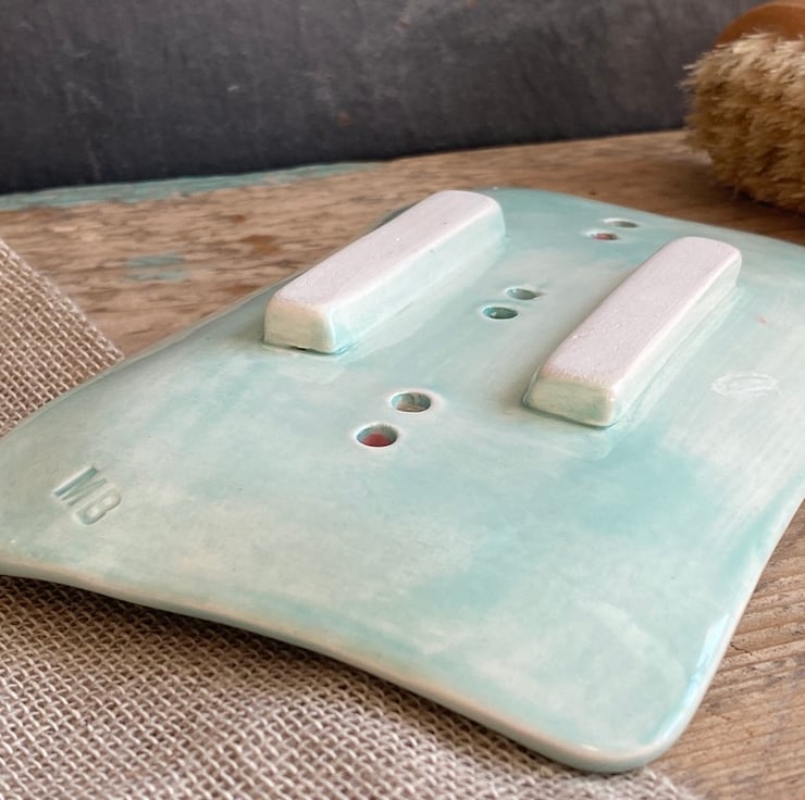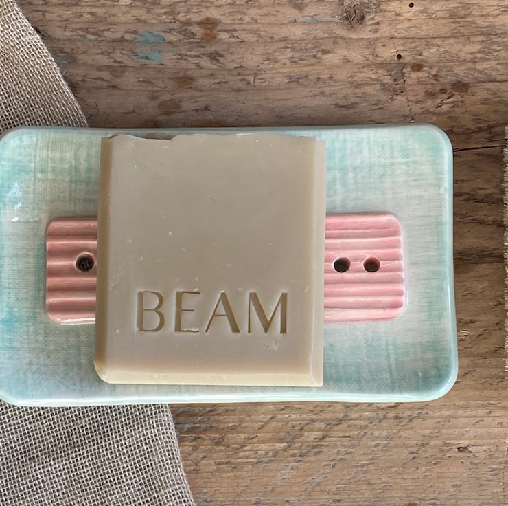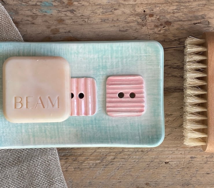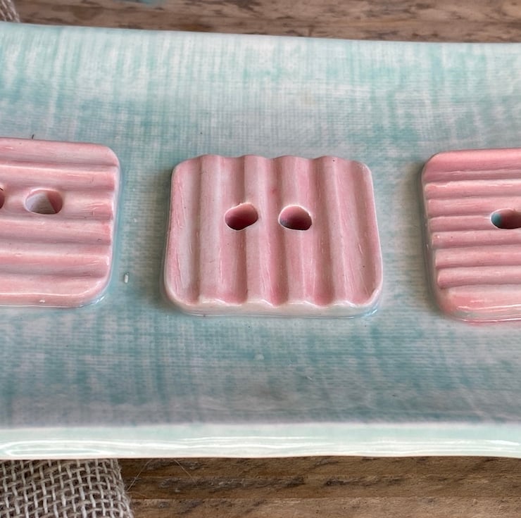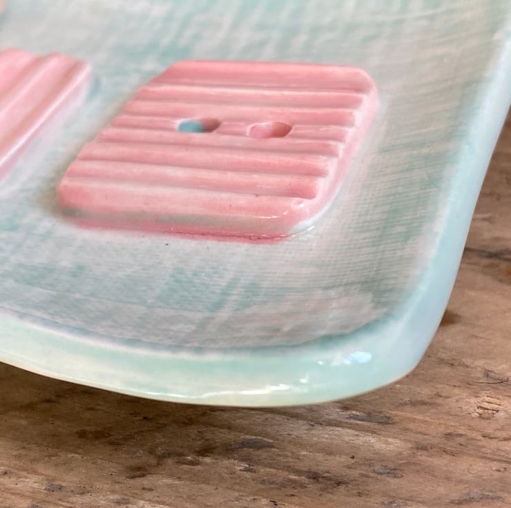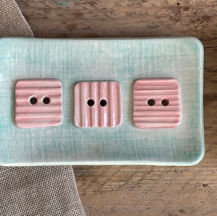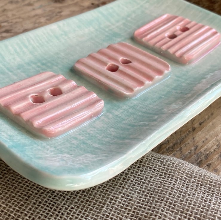 Handmade from earthenware Clay the dish is imprinted with a linen pattern which is picked up by the turquoise glaze. Three fantastic Pink buttons decorate the top and allow the soap to sit above any water and drain through the button holes.