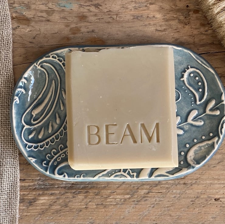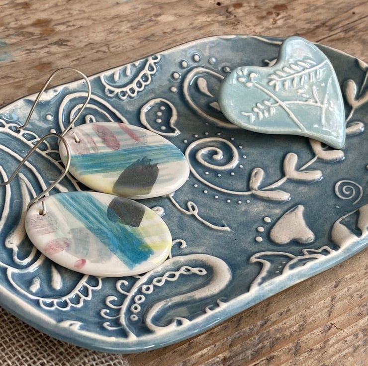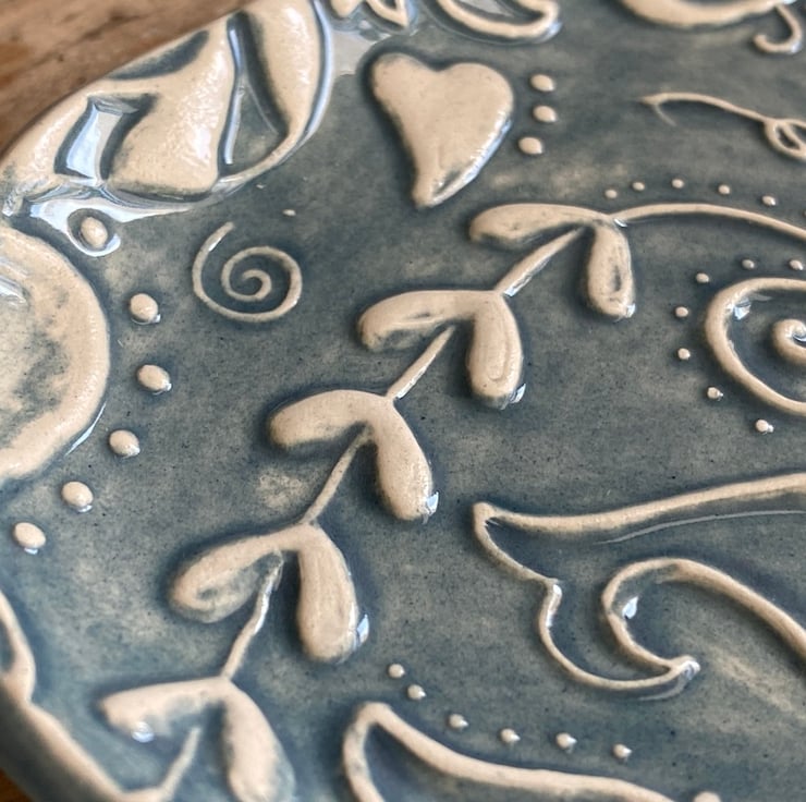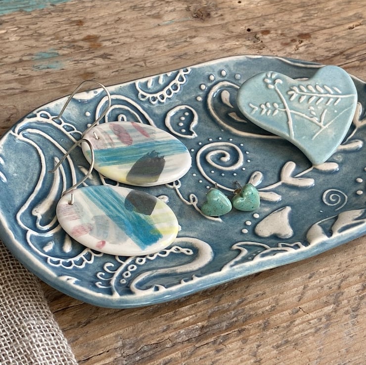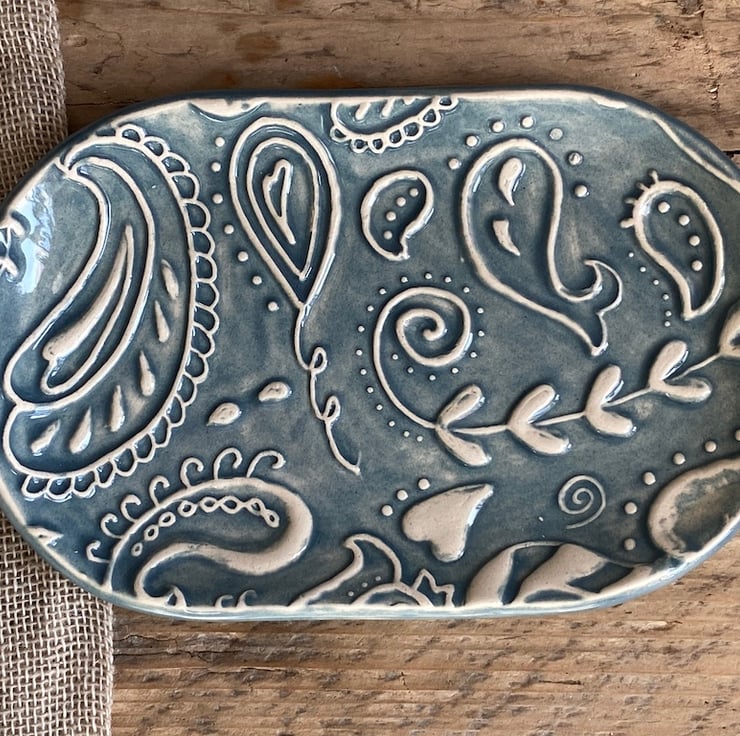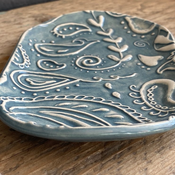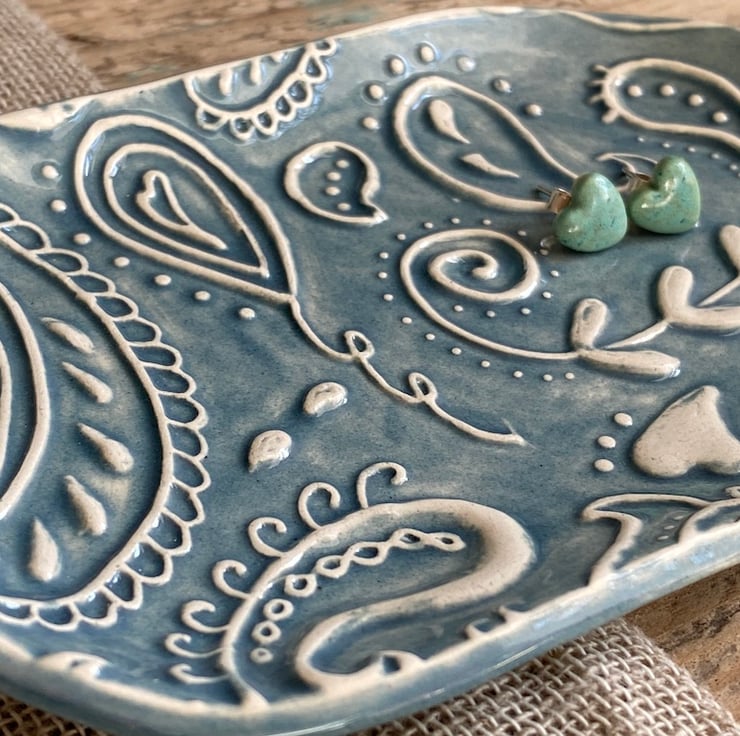 This fabulous whimsical Trinket Dish is imprinted with an original MatildaBelle Paisley Carving. The print gives a raised design which captures the Petrol Blue Glaze beautifully.