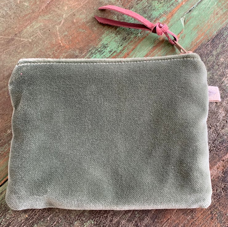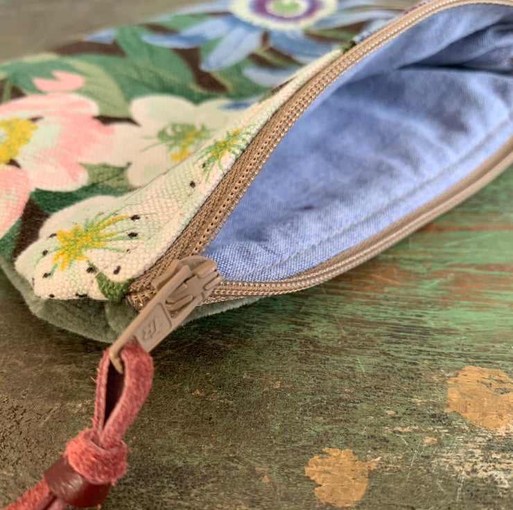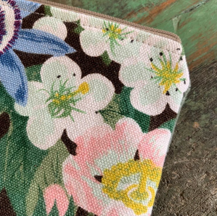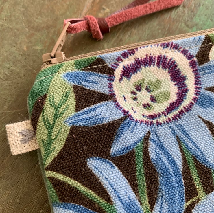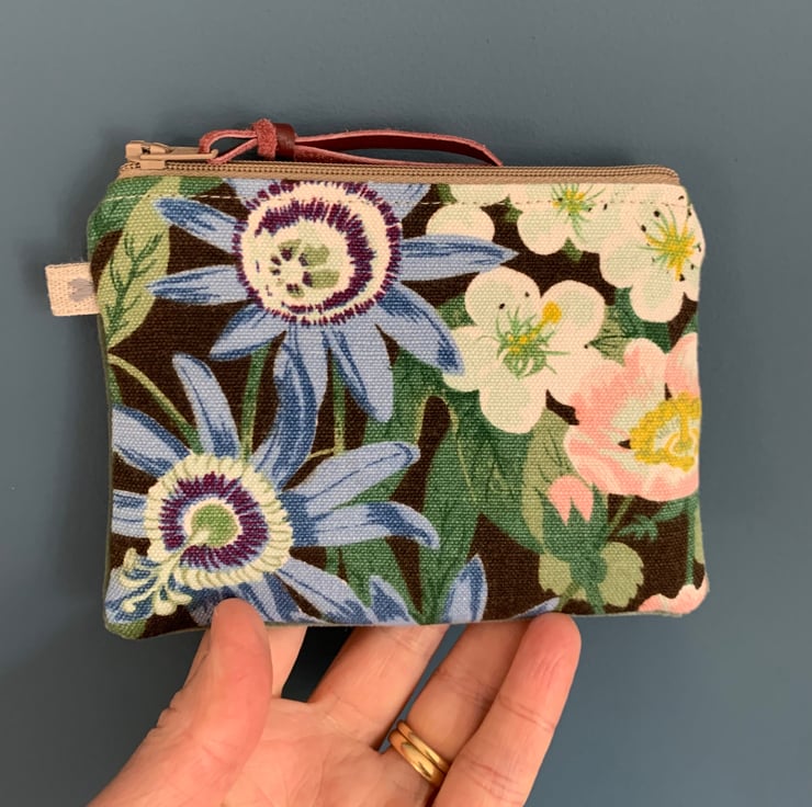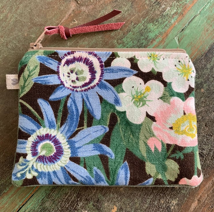 Cute little coin purse made from vintage Jonelle linen union in Belinda print with pretty passion flowers. It is backed with green velvet and lined with blue cotton.