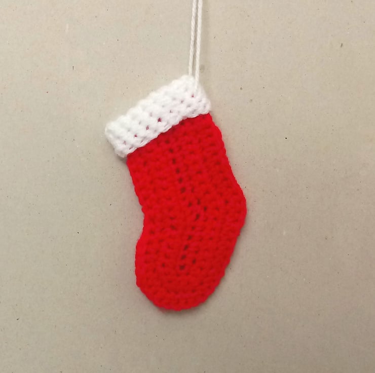 This is a lovely set of three, mini Christmas stockings crocheted in acrylic yarn.