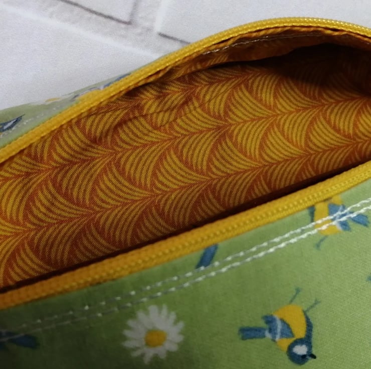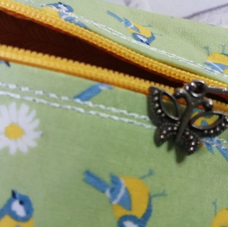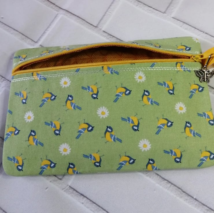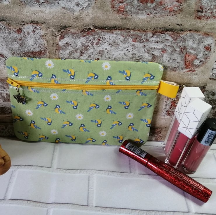 Beautiful fully lined pouch in a lovely green bird design fabric. It's fully lined and has a zip closure with a cute zip charm attached.