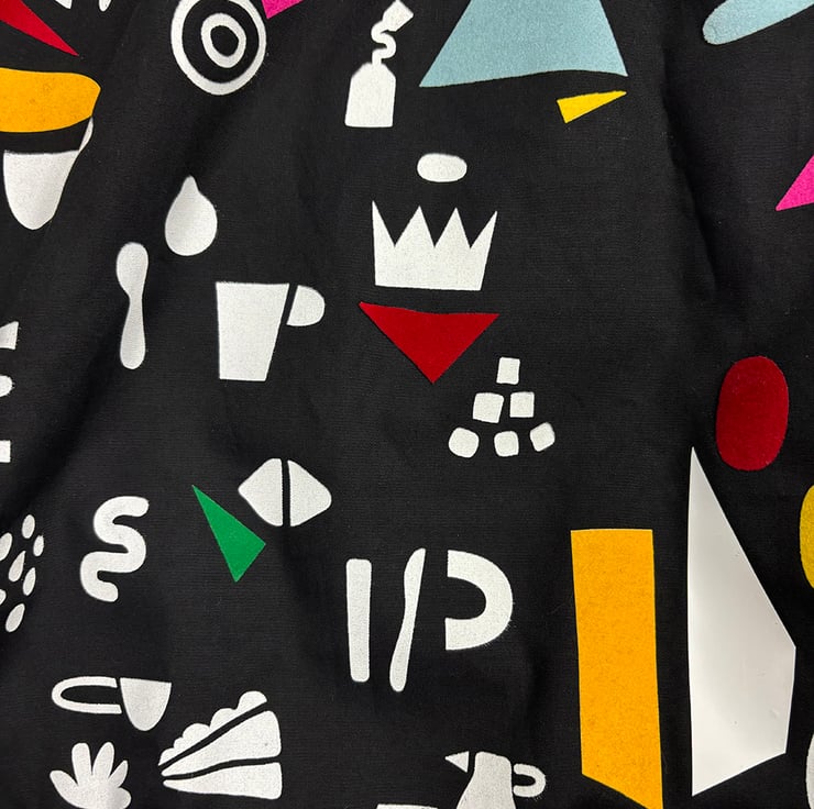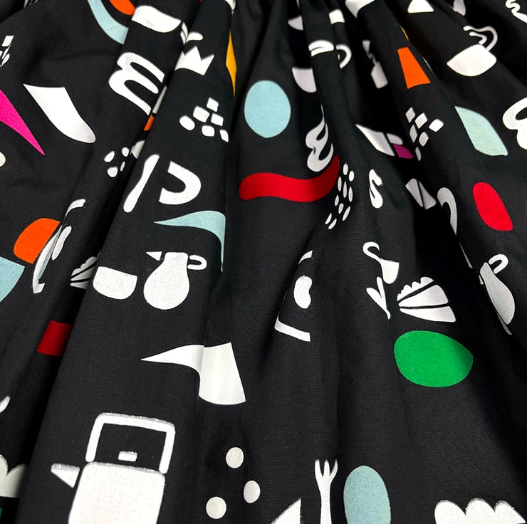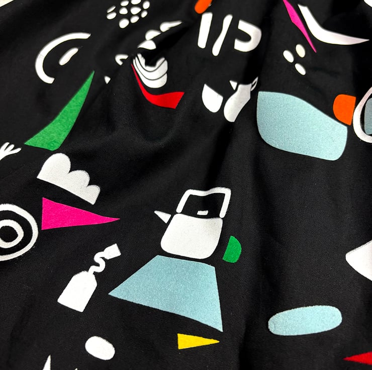 This print was inspired by the 80's jumpsuit worn by Eleven in Stranger Things- I wanted a black-based range with fluid shapes and pops of colour.