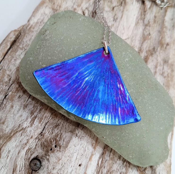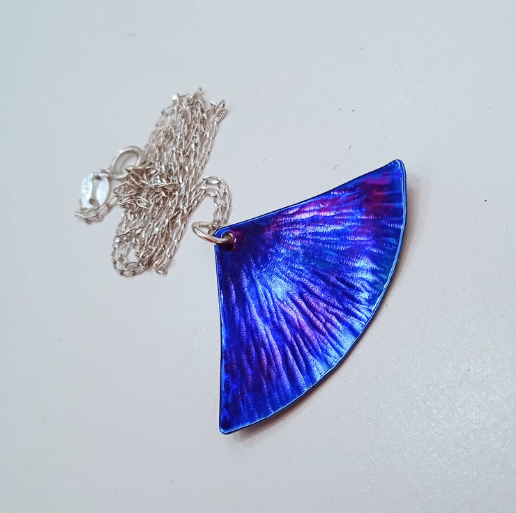 I have created this beautiful pendant by hand sawing the shape from titanium sheet then hammering it to create an interesting texture. I have then domed it to create shape before colouring.