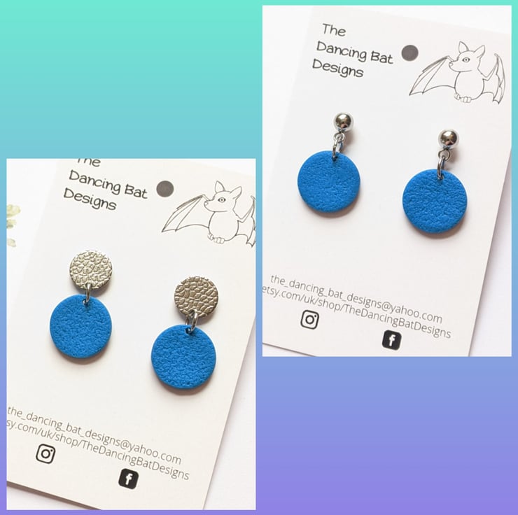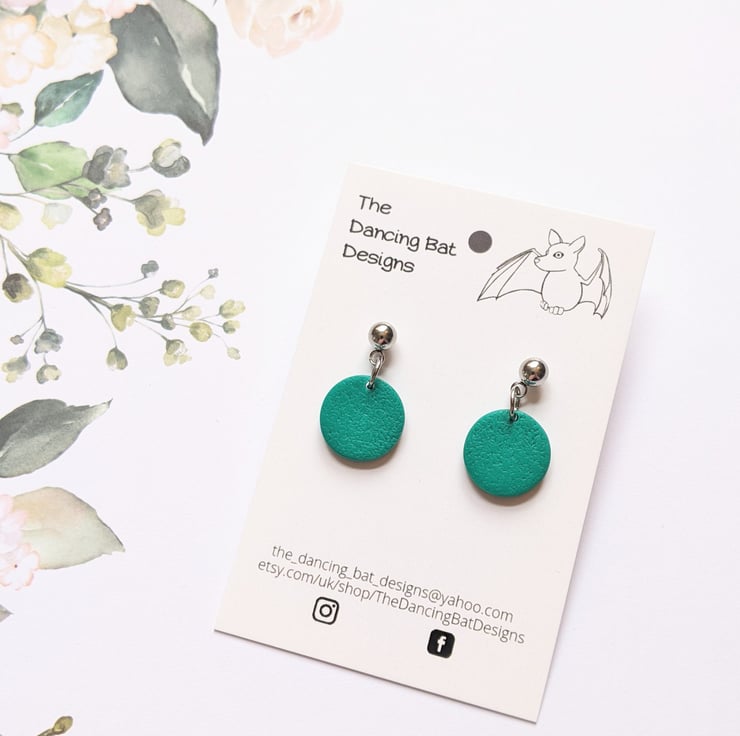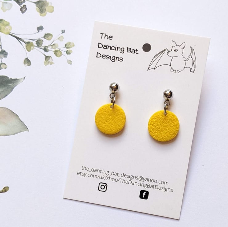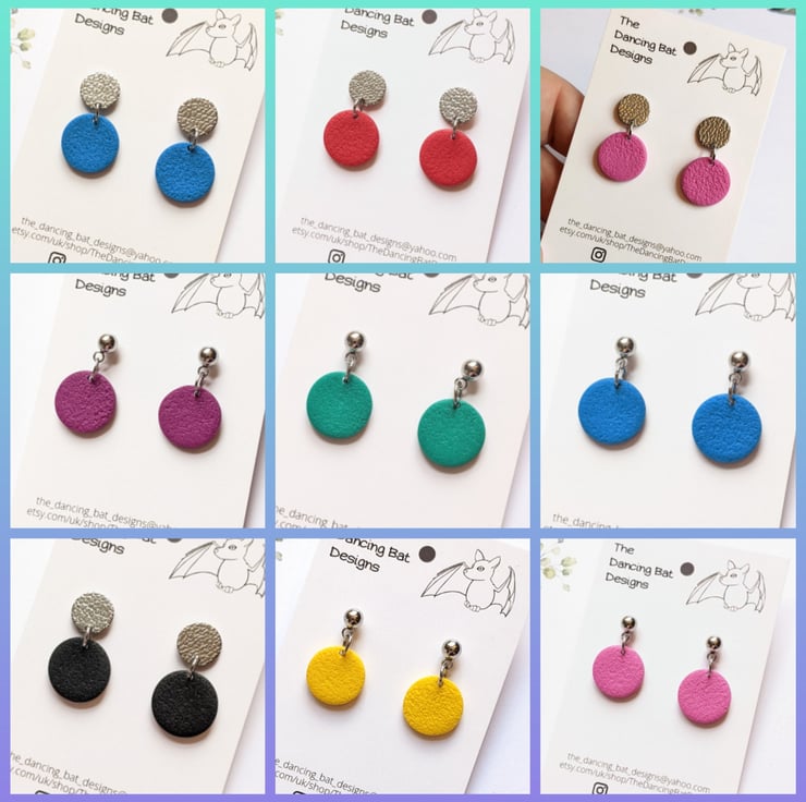 Mini dangle drop earrings, in a small circle shape. Hung from surgical steel posts, with a choice of a ball top or textured circle top. Handcrafted from Polymer Clay.