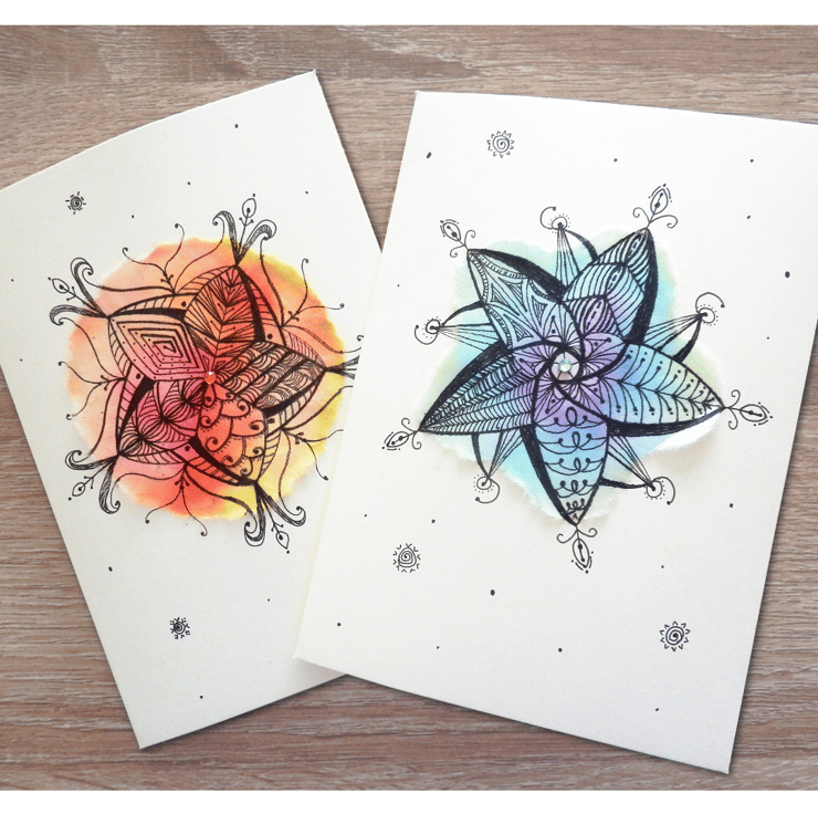 This listing is for two blank notecards featuring a flower drawn on colourful rice paper. Each floral design is hand drawn in black archival ink over a hand-dyed piece of rice paper. One flower has shades of green, blue and purple and the other is in shades of orange and yellow. A coloured gem in the centre completes the flower. The design process means that each card is a one-off.