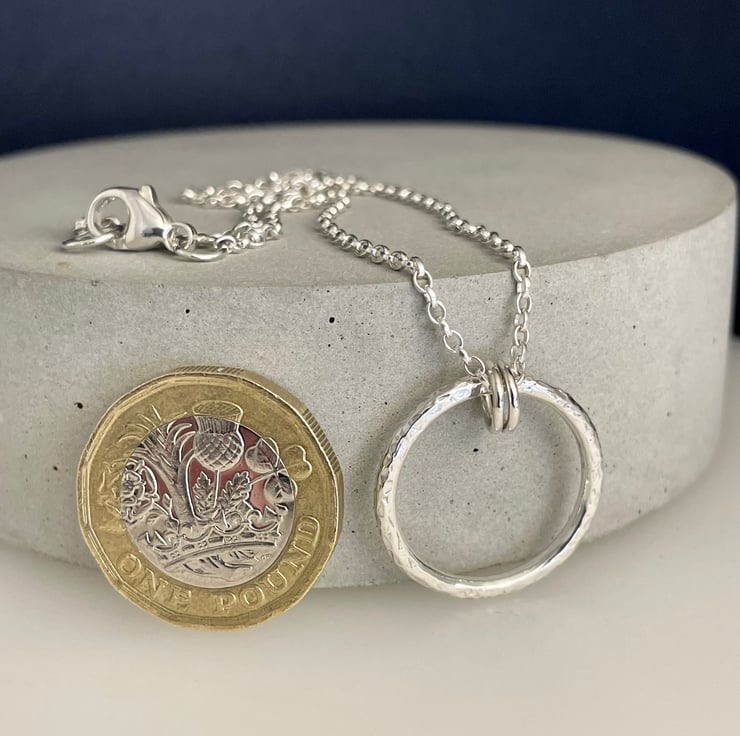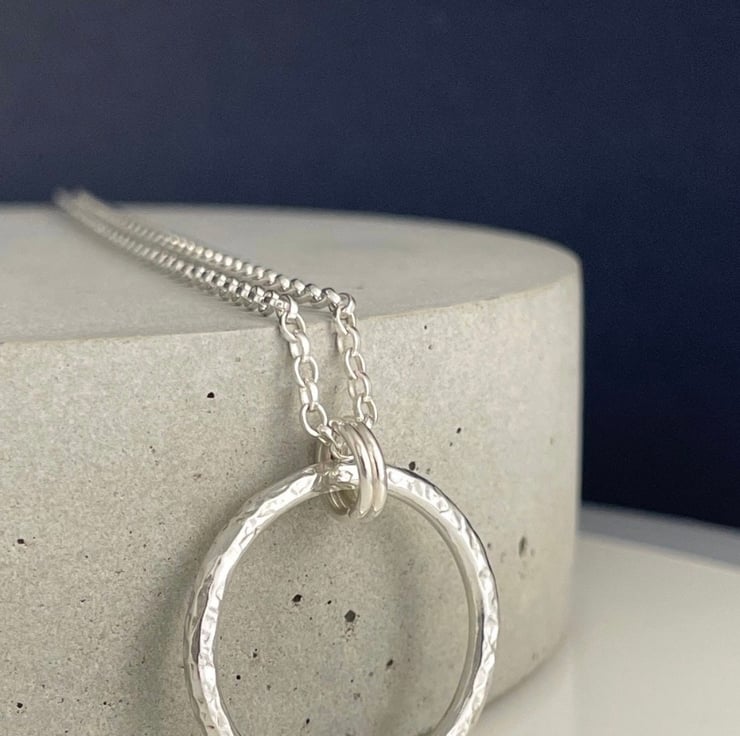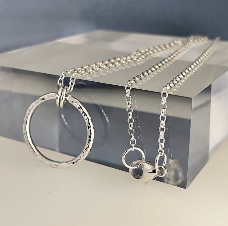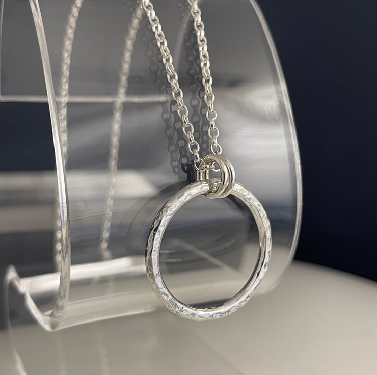 A lovely circle pendant necklace handmade from 925 sterling silver. Cut by hand from solid silver wire, formed into a circle then hammered onto the front and sides to create a an attractive sparkly textured surface. Hung onto belcher chain though two rings along with a trigger clasp as it's fastening.