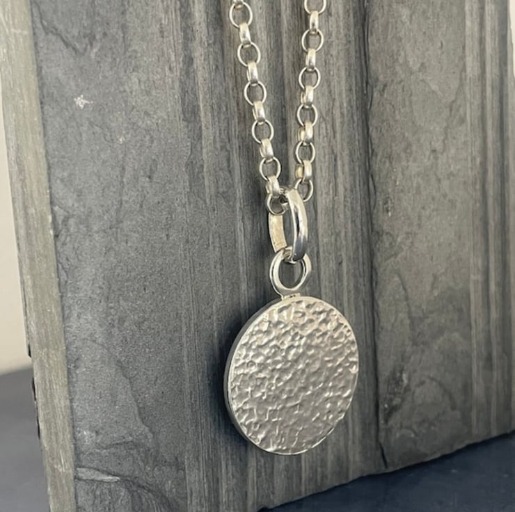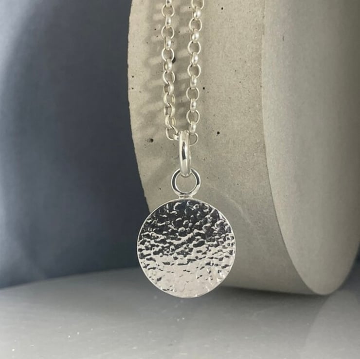 A lovely round disc pendant necklace handmade from 925 Sterling Silver. Cut out by hand from solid 1.5mm thick silver sheet then hammered to create it's attractive sparkly textured surface. Hung onto a complimentary size/weight classic silver belcher chain along with a silver trigger clasp for it's fastening.