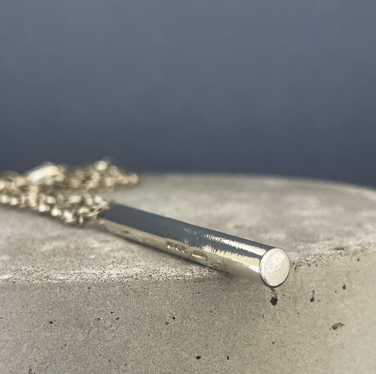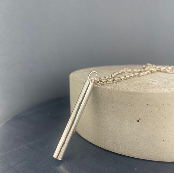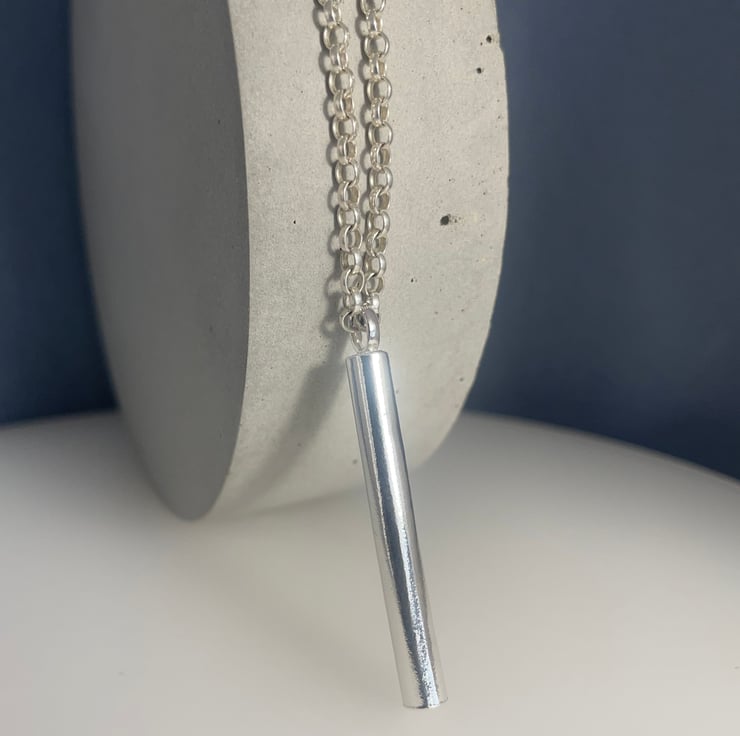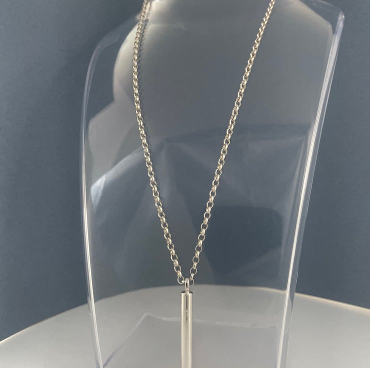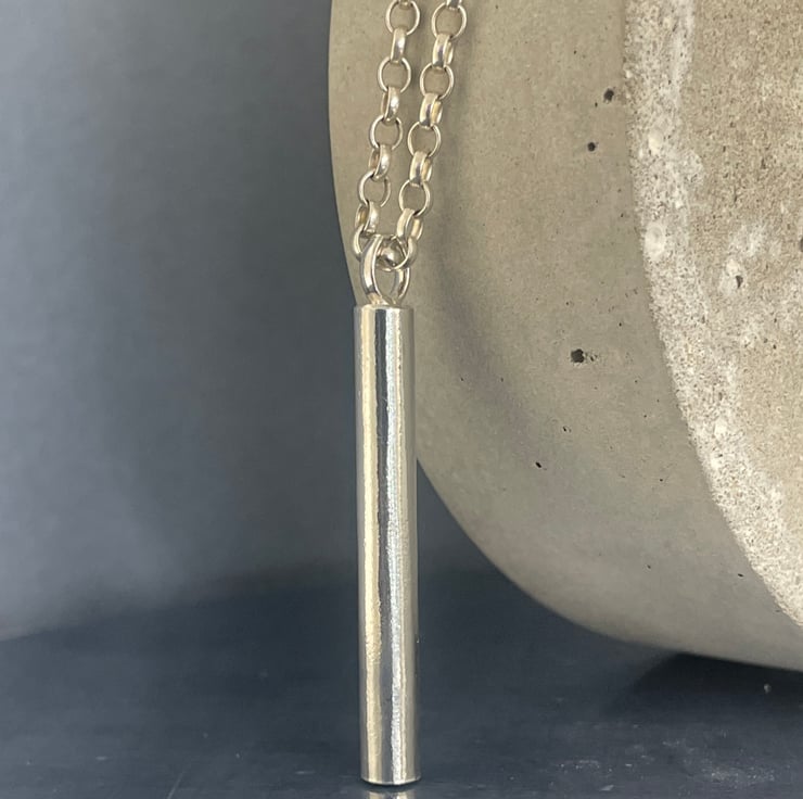 A lovely chunky vertical drop bar pendant necklace handmade from 925 Sterling Silver. Cut by hand from solid 4mm thick round wire and worked to a plain/smooth surface. Hung on to a complimentary sized/weight classic belcher chain along with jump rings and a trigger clasp for it’s fastening.