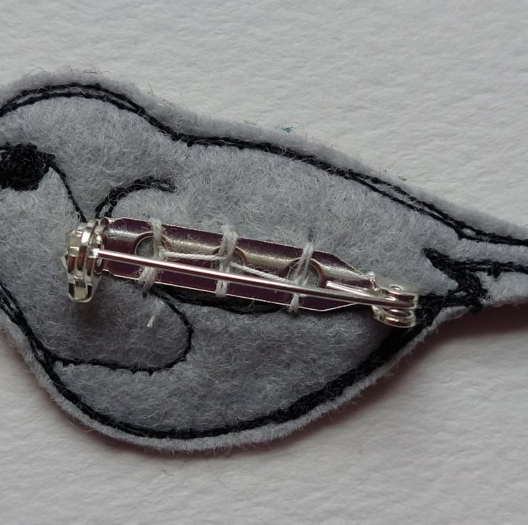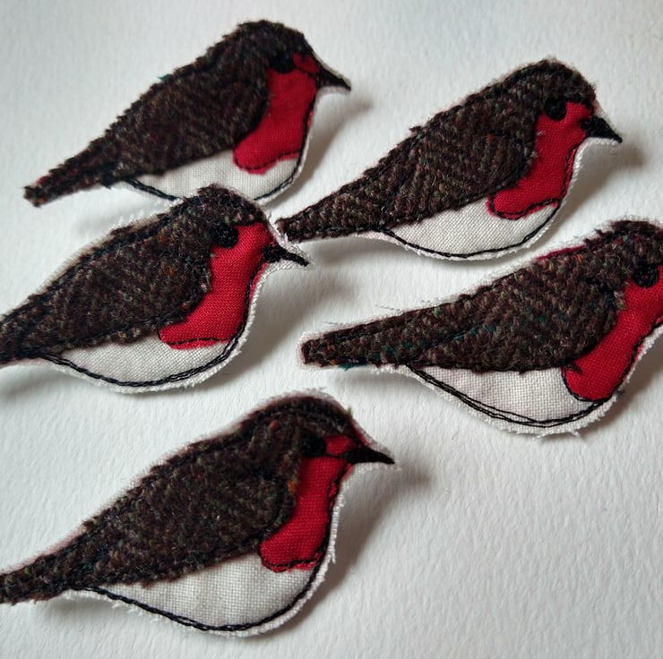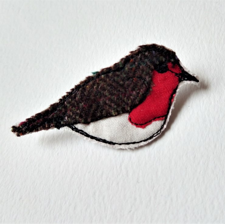 Using my trusty old Bernina sewing machine, each robin is free machine embroidered onto a layer of cotton, embellished with tweed and cotton applique and backed with felt. Once I've added all the details a brooch back is hand sewn in place. Each one is unique and has it's own little character. They measure around 6 cm long.