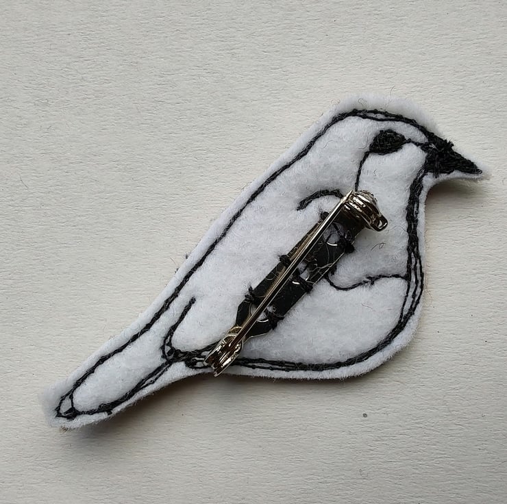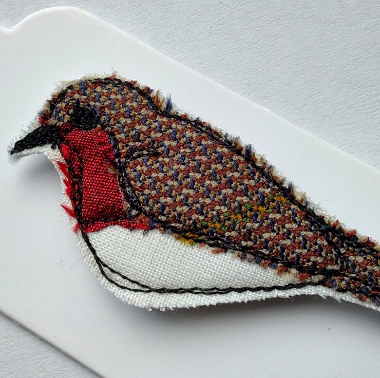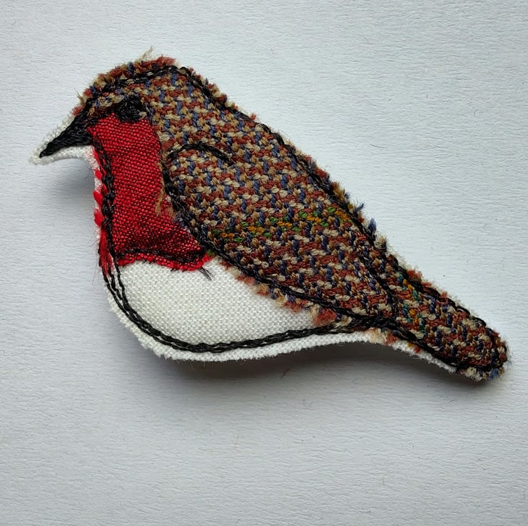 Using my trusty old Bernina sewing machine, each robin is free machine embroidered onto a layer of cotton, embellished with tweed and cotton applique and backed with felt. Once I've added all the details a brooch back is hand sewn in place. Each one is unique and has it's own little character. They measure around 6 cm long.