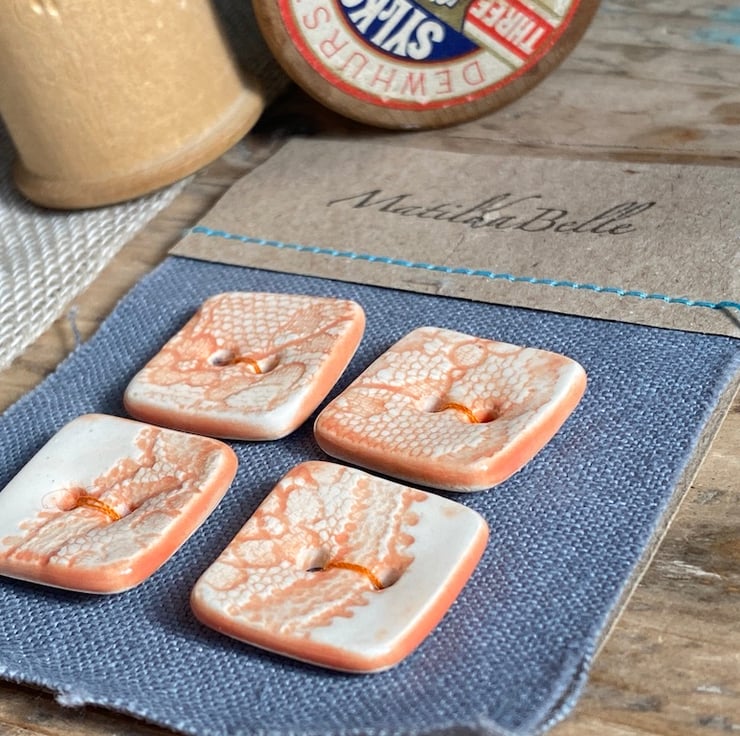 These square buttons have been imprinted with vintage lace and glazed in a rich vibrant Orange.