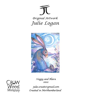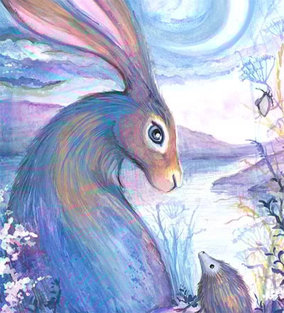 Inspired by an evening visit by a very friendly and hungry hedgehoggy whilst wild camping in the North of England, we sat by the fire and watched the hares lolloping around curiously sniffing the air. Digital copy taken from an original painting on watercolour board in gouach and watercolours.