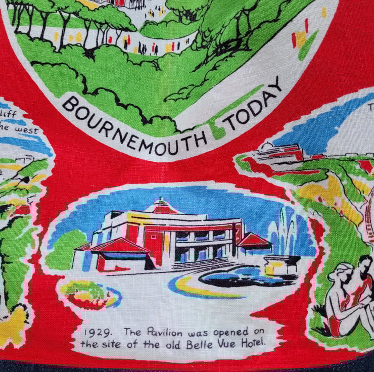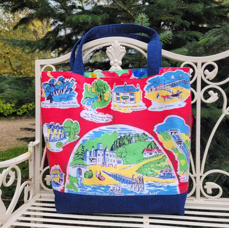 Large tote bag is made from a vintage, unused teatowel featuring scenes of Bournemouth, mixed with denim and a contrasting floral lining. The straps are made from matching denim.