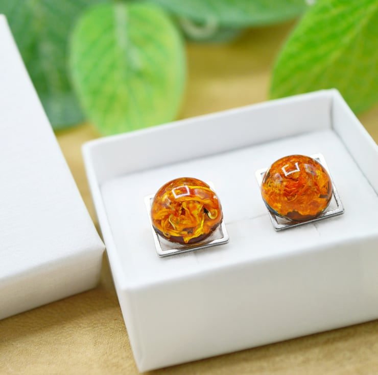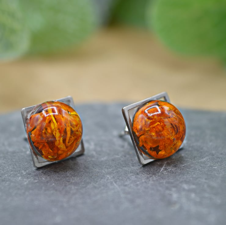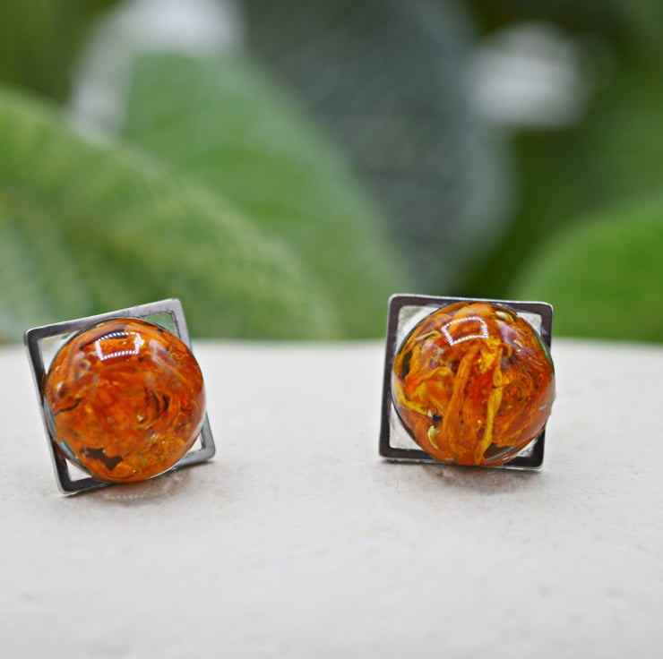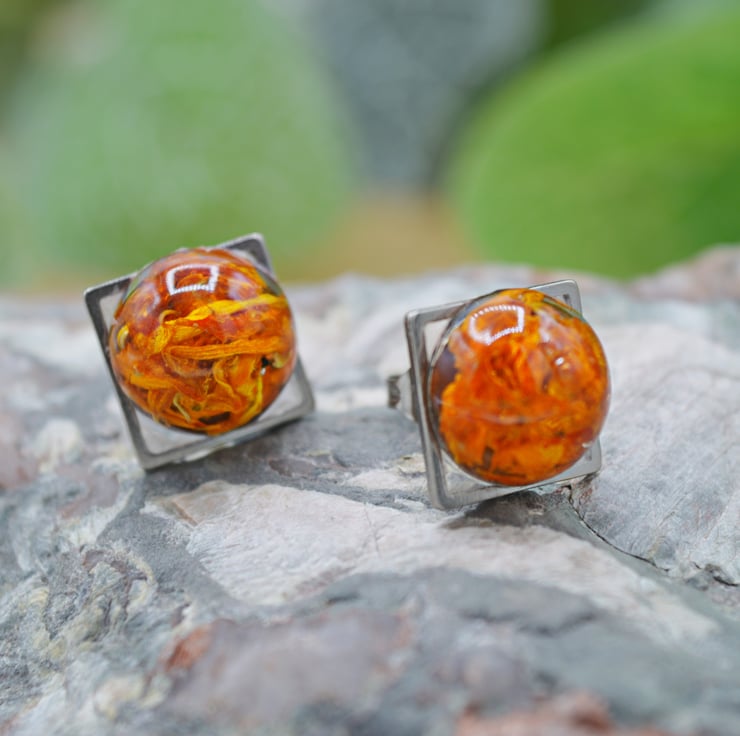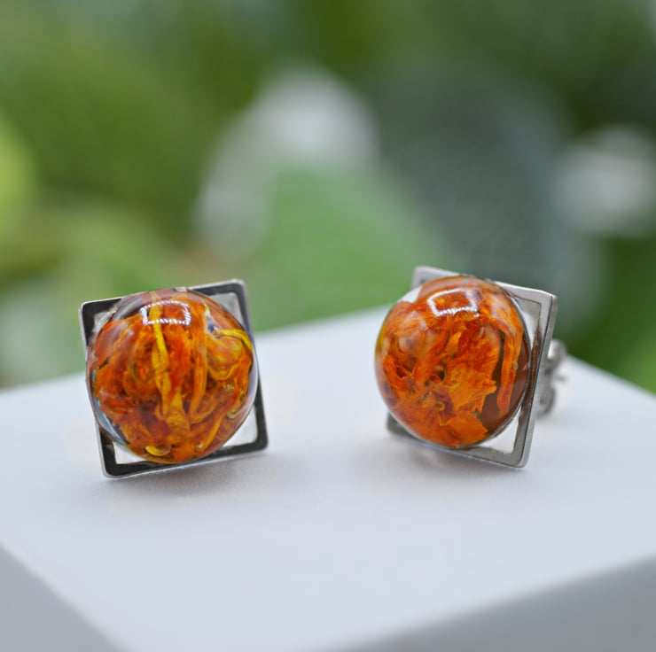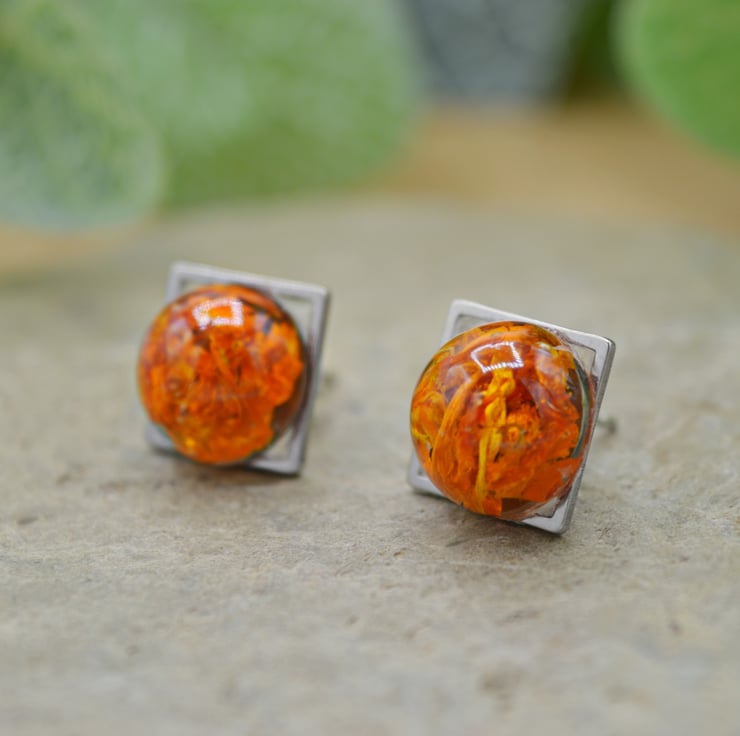 As part of the "Fleur Real Collection" are these floral Stud Earrings made with genuine natural high quality freeze dried Marigold Petals, various shades of Orange cured within high gloss Resin.